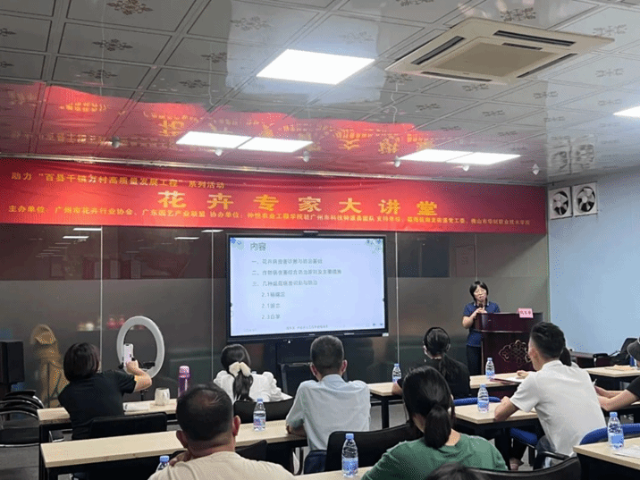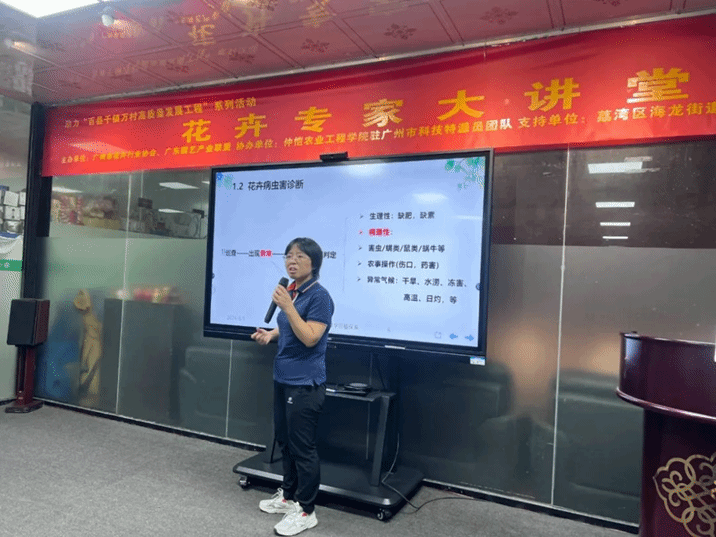 2024年8月1日,广州市科技特派员团队赴广州大观园艺科技有限公司开展一场主题为《盆花主要病虫害识别与综合防治》培训讲座。此次培训由广州市花卉行业协会梁文婷主持,特别邀请了m88 app程东美副教授主讲。吸引了众多盆花种植者和相关从业人员参与。