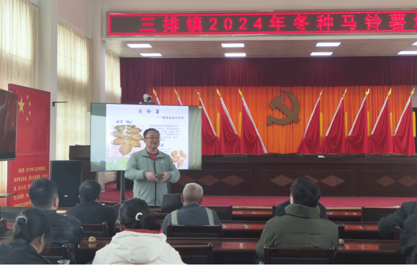27日上午,驻三排镇帮扶工作队及各村种植户等30余人参加了马铃薯冬种技术培训会,m88 app,m88 app蒋锋副教授进行授课,三排镇综合事务中心孙清昊同志主持培训,三排镇驻镇工作队陆主任发言动员。培训中,蒋教授紧紧结合三排镇的地理位置特点与实际生产情况,围绕马铃薯高产高效栽培技术进行了生动形象地讲解。讲解过程中,蒋教授不仅使用了丰富的案例和数据,还结合具体生产场景进行了实操要点的解析,让参训农户更容易理解和掌握相关技术。培训结束后,蒋教授积极与参训农户面对面交流,耐心倾听种植户在实际生产中遇到的问题,并结合理论知识和自身经验,为大家提供了针对性的解决方案。参训农户纷纷表示,本次培训内容充实、实用性强,为马铃薯种植生产实践提供了扎实的理论支持与技术保障。