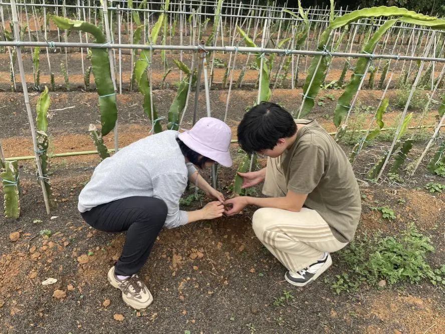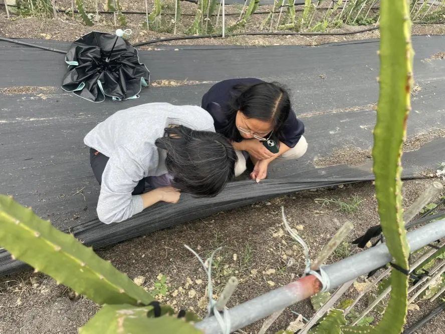 在田间施药过程中发现,火龙果种植田内多处有红火蚁成群出现,特派员韩群鑫教授与颜珣研究员检查蚁穴位置,嘱咐实验调查人员与工人应注意防护,培训相关注意事项,强调基地对于红火蚁防治要引起重视,及时施用饵剂等防治药剂,避免造成人员安全问题。