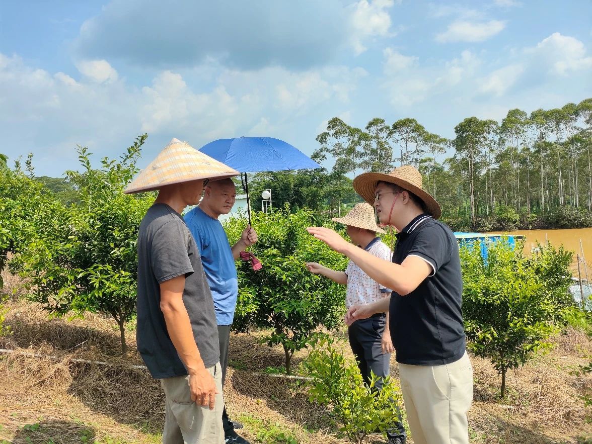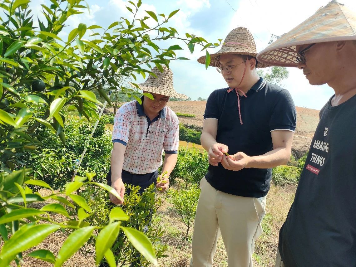 烈日灼灼,热浪翻涌。7月5日,恩平那吉农村科技特派员、m88 app吴仲真副教授和曹亮副教授到恩平那吉开展科技下乡。37℃酷暑高温,阻挡不了奔赴茶枝柑新种基地的脚步,为当地种植户精准把脉新果园健康生产,带去关键的科技支撑。
