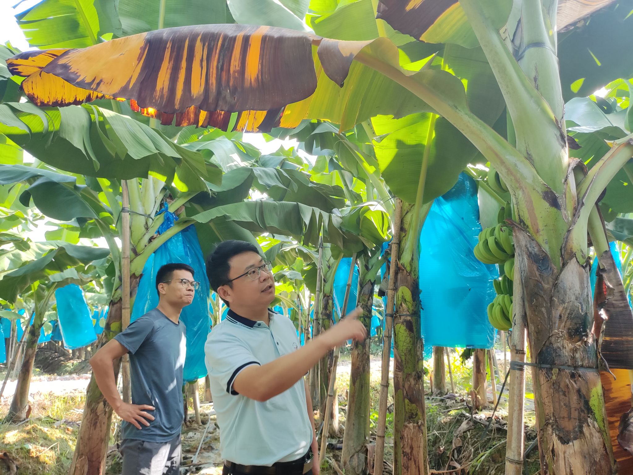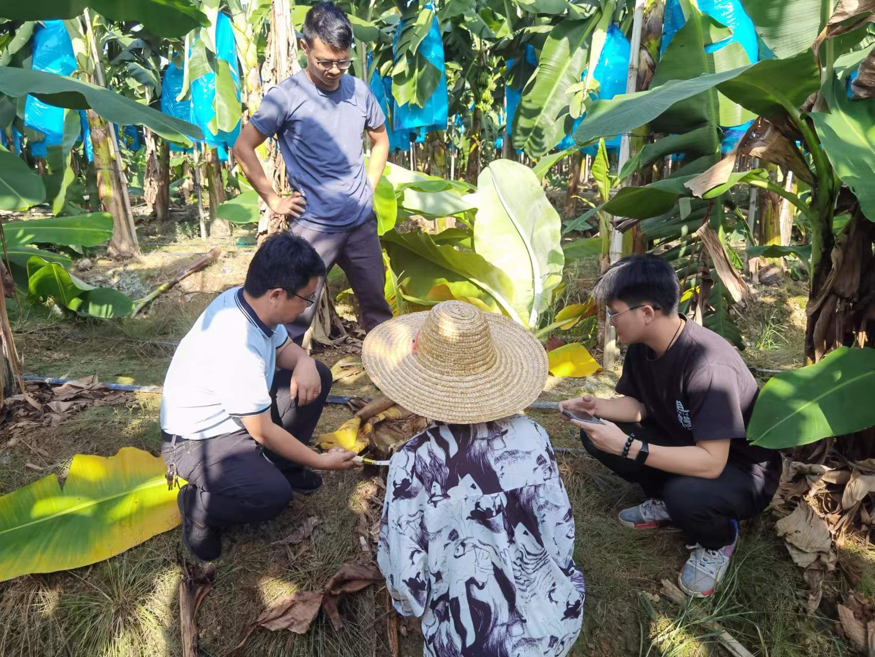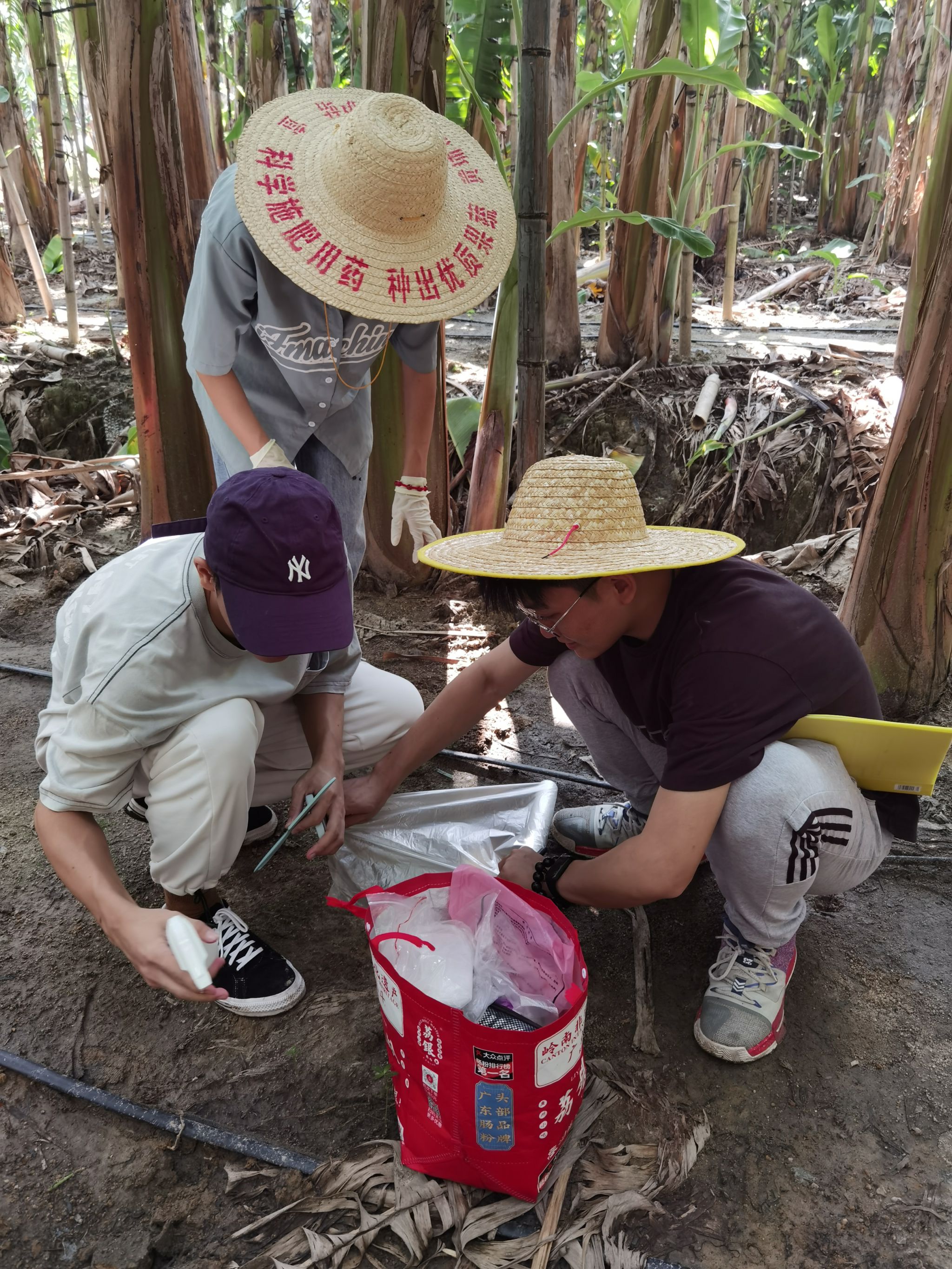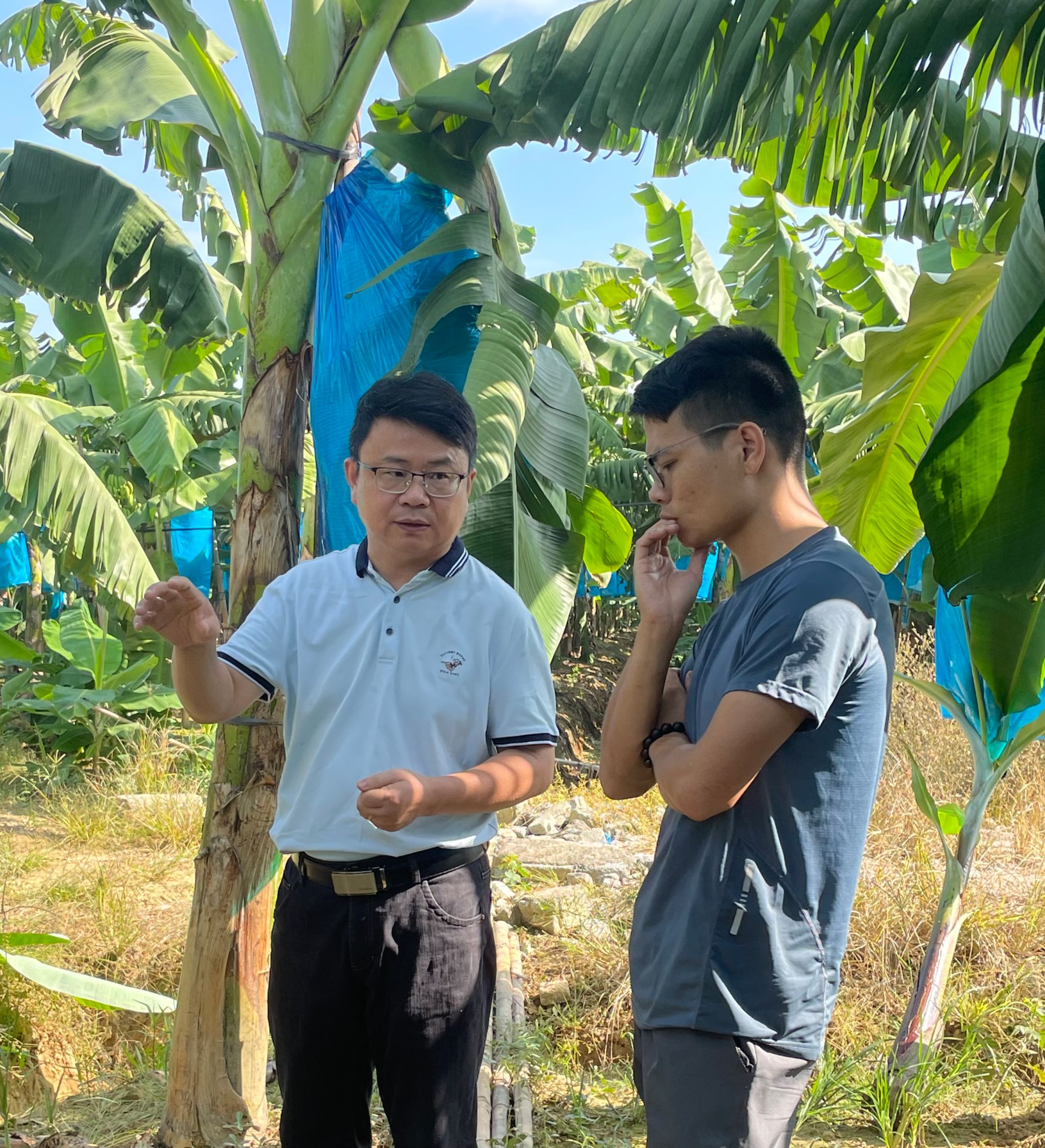 自2019年开始,喻国辉教授带领团队在上述地区开展研究工作,他们的目标是实现香蕉枯萎病的可持续绿色防控。这种防控方式不仅对环境友好,而且可确保香蕉的产量和品质。在广东省农业农村厅2023年乡村振兴战略专项-动植物疫病防控项目资金的支持下,喻国辉教授团队与佛山三水、恩平圣堂和阳江阳春的种植大户签订合作协议,建设了500亩以上的香蕉枯萎病绿色防控示范基地,为农户免费提供用于防控的微生物菌剂,并通过线上指导和定期现场调查,确保示范效果。