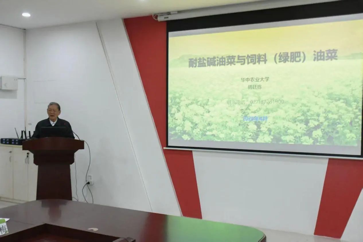 在生命科学大楼A座607会议室,傅廷栋院士首先以《油菜饲用及改良盐碱地的实践及其战略意义》为题作作学术报告。他从我国油菜产业的发展趋势与现实需求出发,分享了团队多年来在耐盐碱油菜品种选育及油菜多功能利用上取得的一系列重大成果,展示了耐盐碱油菜品种在盐碱地生态修复中的创新实践及饲料(绿肥)油菜在新疆等地的推广经验。报告内容生动详实,引发师生强烈共鸣。在提问互动环节,傅院士与师生就油菜抗逆育种、全产业链开发等话题进行了深入交流。