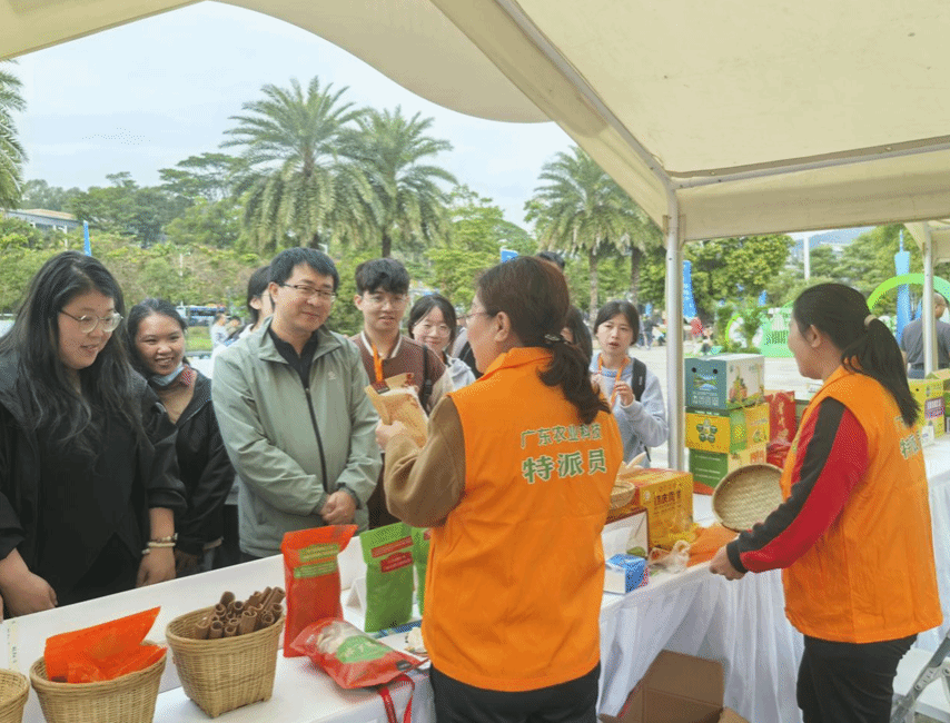 期间,在张伟丽老师的带领下,同学们来到了德庆县农技推广服务驿站的展位前,不仅品尝了甘甜多汁的德庆贡柑,还学习了多种南药的种植和生长过程,对广东种业的现状有了更加丰富的了解。