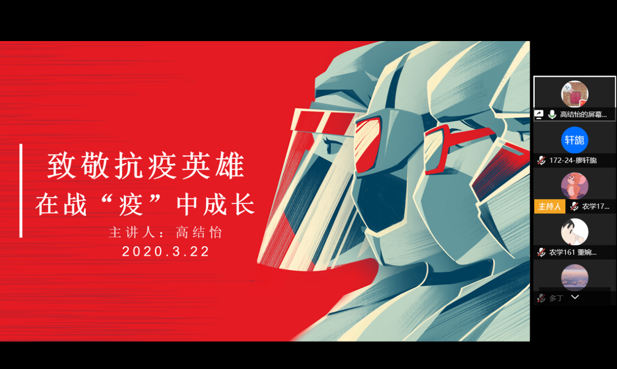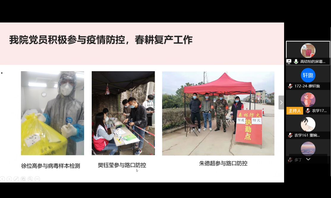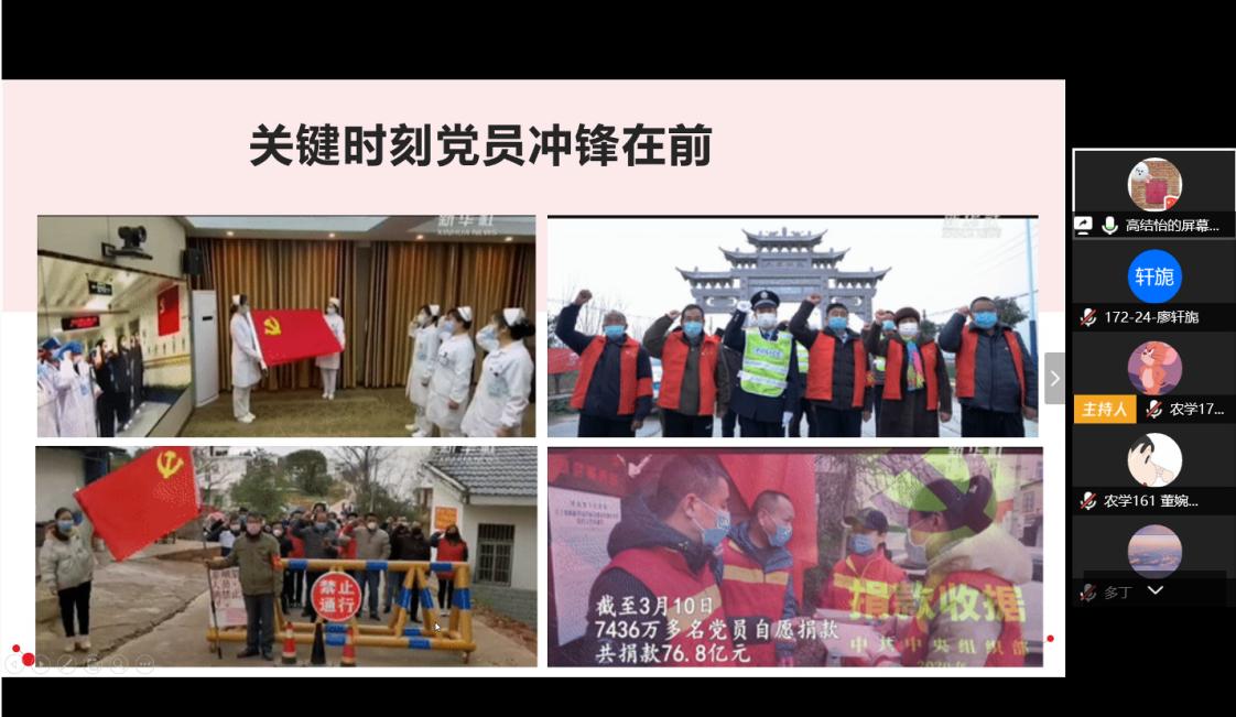 最后,高结怡号召大家要增强“四个意识”,坚定“四个自信”,做到“两个维护”,切实把思想行动统一到习近平总书记重要指示精神上来,认清肩负的责任使命,并就学生党员在抗疫过程中应如何发挥先锋模范作用提出了四点要求:第一,增强自我防范意识和防护能力;第二,严格遵守所在地政府规定和学校规定,积极配合所在地疾控等部门工作;第三,做好宅家学习、生活的表率,增强自律性,做好榜样示范;第四,在做好安全防护的同时行动起来,主动担当作为,亮明身份,结合实际就地参加当地的疫情防控工作和经济社会发展工作。