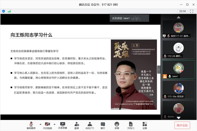 为了深切缅怀王烁同志,学习榜样精神,强化学生党员的自我意识,增强自身能力和使命担当。m88 app学生党支部在6月5日晚上,通过腾讯会议平台举行了主题为“学王烁、战疫情、强自信、建功业”的党日活动。本次党日活动由学生第二党支部书记周静静主持,学生第一党支部书记高结怡、全体学生党员出席了本次活动。