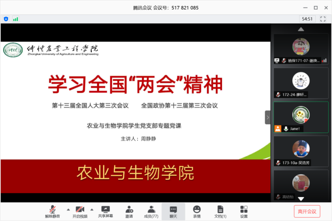 接着,周静静对两会十大民生热点作了详细的解读,并带领大家学习了全国两会精神及中央领导“两会”期间讲话精神。她特别提到,在看望参加政协会议的经济界委员时,总书记强调做好“六稳”工作、落实“六保”任务,以人民情怀筑牢民生幸福根基;在内蒙古代表团,总书记着眼中华民族长远发展,明确要“牢固树立生态优先、绿色发展的导向”,倡导“留与子孙后代”的发展理念,保持加强生态文明建设的战略定力;总书记还专门来到湖北代表团,礼赞抗疫奉献者,深刻阐释如何践行人民至上;在解放军和武警部队代表团,习主席作出“坚持底线思维,全面加强练兵备战工作”“探索常态化疫情防控条件下练兵备战方式方法”等一系列重要指示,凝聚起强国兴军的磅礴力量。她强调,在座的学生党员一定要认真学习领悟两会精神,将学习两会精神的政治热情转化为学习研究和创新创业的实质动力。此外,她还对积极参与“三支一扶”和西部计划的毕业生党员给予了表扬,肯定了他们不畏困难、挺难而上的新时代青年担当和奉献精神,并鼓励其余的学生党员们努力学习,发挥好先锋模范作用,引领好学风和院风,毕业后积极创新创业,扎根基层,为国家的乡村振兴战略做出突出的贡献。