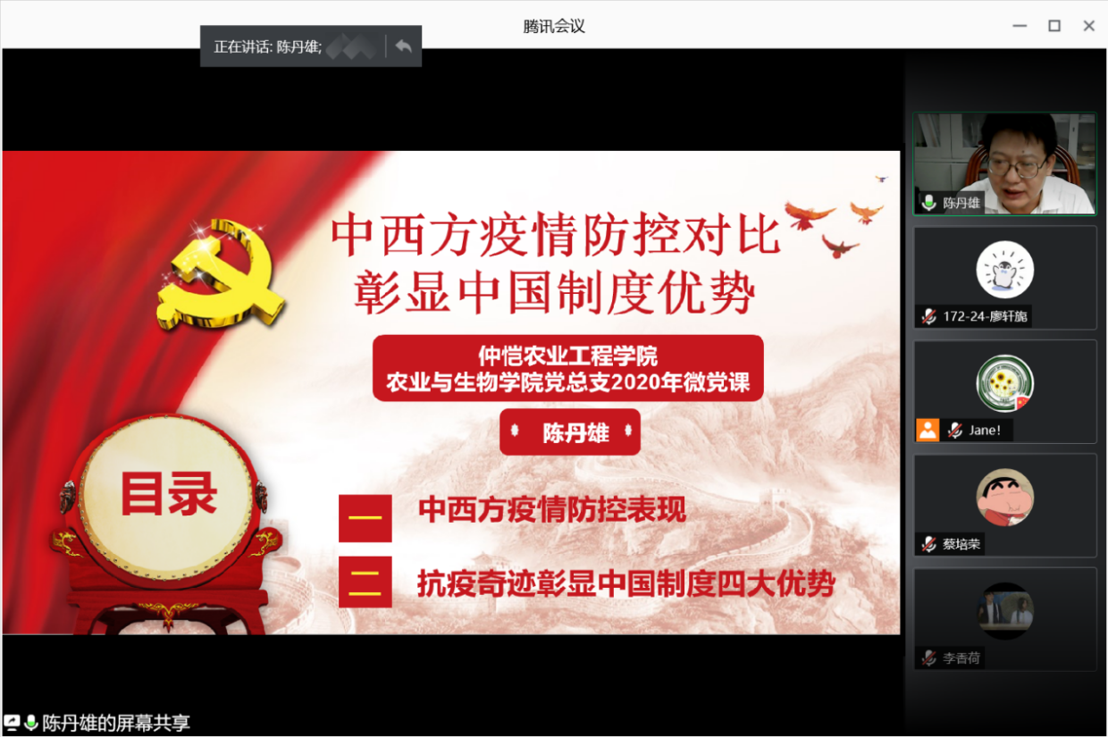 接着,陈丹雄以《中西方疫情防控对比彰显中国制度优势》为主题给全体党员上了一堂微党课。他首先分析了中西方疫情防控的表现,回顾了我国疫情防控的历程,并与西方目前的疫情局面作对比,强调中国疫情防控之所以能创造世界奇迹,是因为奇迹背后正是中国特色社会主义的制度优势。之后,陈丹雄围绕着政治优势、体制优势、价值优势、文化优势等四个方面,结合疫情防控中的具体事例阐述了我国制度优势在本次疫情防控过程中的具象化呈现。他指出,通过中西方疫情防控表现对比,彰显了社会主义制度的四大独特优势和优越性,党员们应增强“四个意识”,坚定“四个自信”,坚决做到“两个维护”,以抗疫精神为动力,为实现学校第五次党代会确立的目标而砥砺奋进,为全面打赢疫情防控的人民战争、为中华民族的伟大复兴而努力奋斗。