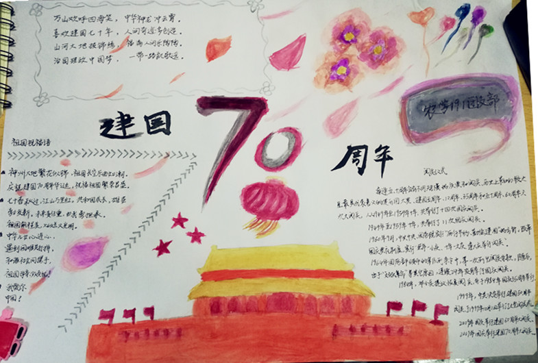 该报入眼即是下端色彩鲜明引人注目的天安门城楼,这是中国的标志。中间是建国七十周年的大字,70下端还画有一盏红色的大灯笼,独具中国文化特色,右上角是气球和牡丹花,气球代表着我们对建国七十周年的庆祝和欢迎,牡丹则是代表国家文化形象的花卉,寓意繁华富贵和圆满。同时整张页面带有飘零的花瓣以增强美感,右边的框框标注着农学191团支部,表明我班身份,右下角叙述了我国阅兵仪式的发展,左下角即是我班对祖国的祝福语,右上角是契合建国七十周年的一首诗。整体画面清新,具有浓厚的爱国主义色彩,画风自然。