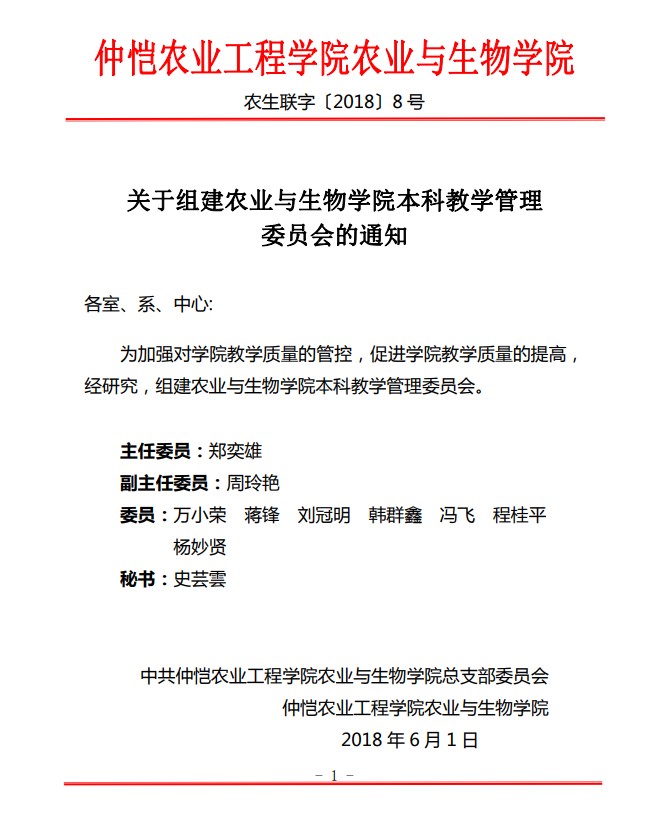 农生联字〔2018〕8号-关于组建m88 app本科教学管理委员会的通知