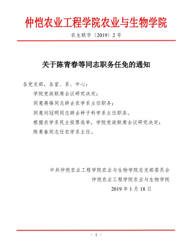 农生联字〔2019〕2号-关于陈青春同志任职的通知