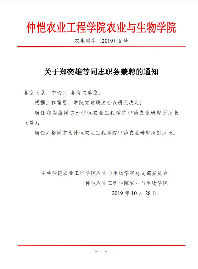 农生联字〔2019〕6号-关于郑奕雄等同志职务兼聘的通知