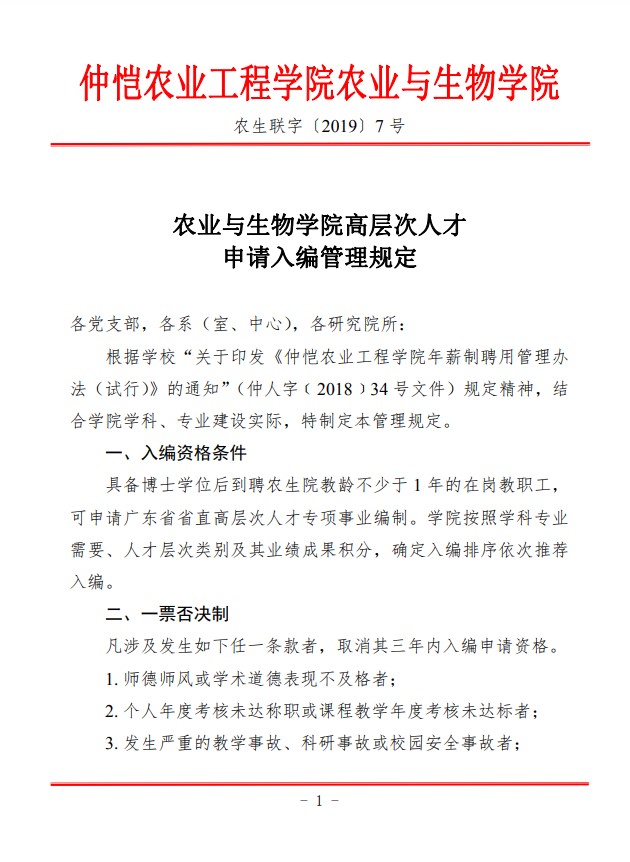 农生联字〔2019〕7号-关于高层次人才申请入编管理规定