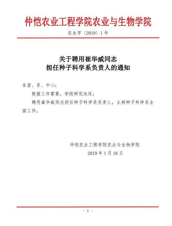 农生字〔2019〕1号-关于崔华威同志任职的通知