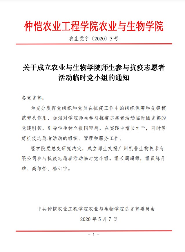 农生党字〔2020〕5 号-关于成立m88 app师生参与抗疫志愿者活动临时党小组的通知