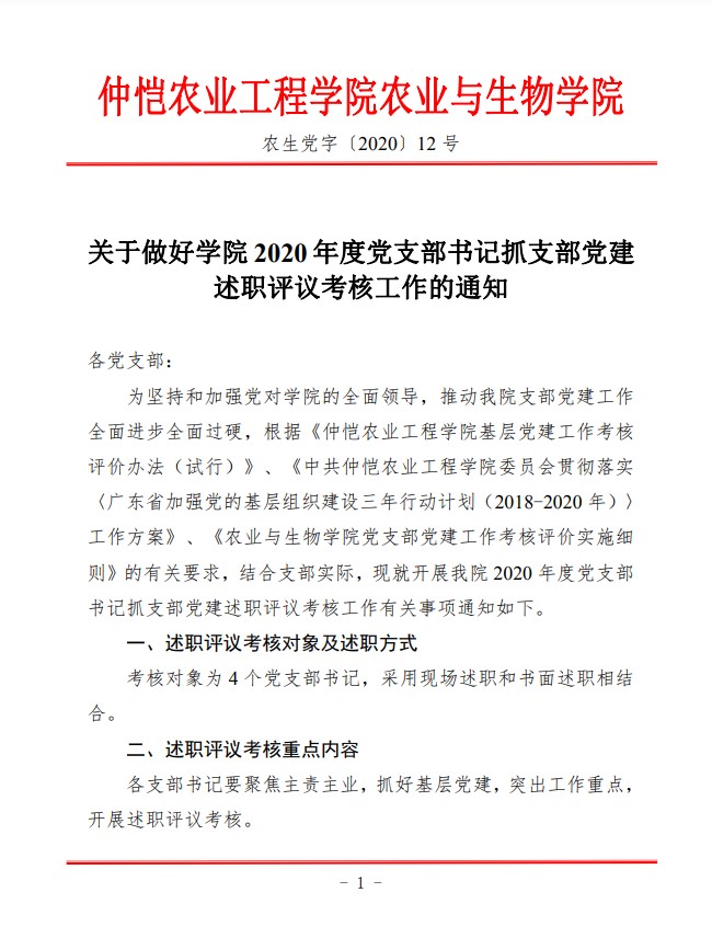 农生党字〔2020〕12号-关于做好学院2020年度党支部书记抓支部党建述职评议考核工作的通知
