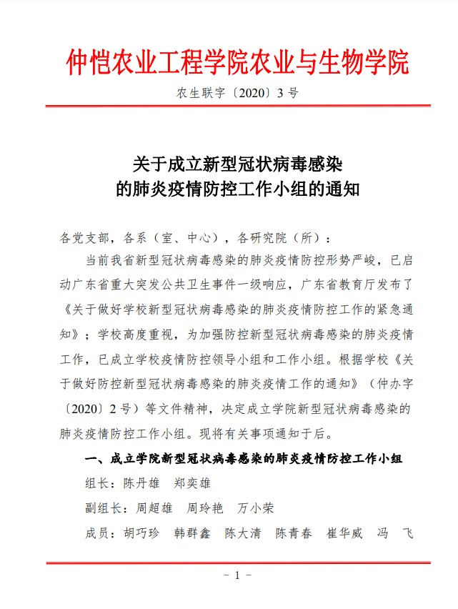 农生联字〔2020〕3号-关于成立防控新型冠状病毒感染的肺炎疫情工作领导小组的通知