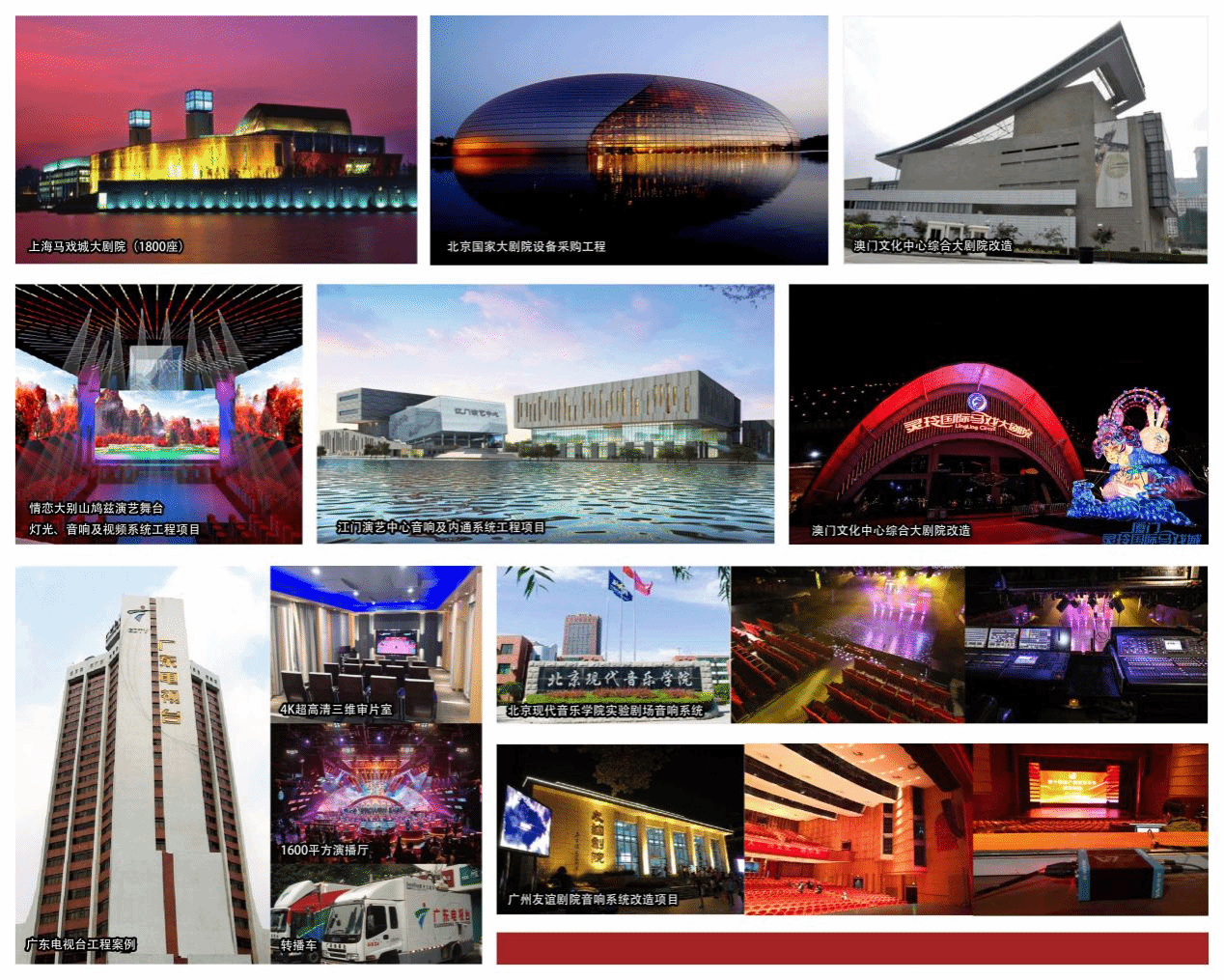 自林海彬成立公司至今,先后承接了北京国家大剧院、湖州大剧院、广州中山纪念堂、星海音乐学院、星海音乐厅、四川都江堰体育馆、广东电视台、广州广播电视台、中山电视台、北京战友文工团、湖南歌舞剧院、广东舞蹈学院、深圳音乐厅、江门演艺中心、澳门文化中心综合大剧院改造、湖南省歌剧院、广州大剧院音频系统、顺德演艺中心灯光、灵玲国际马戏团、顺德华侨城、阳春市工人文化剧院、广东民族乐团录音棚系统、音响系统工程项目等。