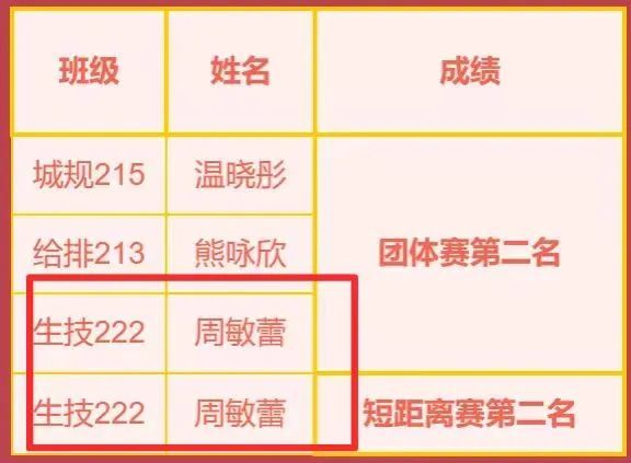 同时,也要向生技222的周敏蕾同学及其团队表示热烈的祝贺,荣获第二名的好成绩!同时周敏蕾同学还获得了短距离赛第二名的佳绩。他们的努力和坚持是所有人学习的榜样。希望他们继续努力,不断超越,再创佳绩!