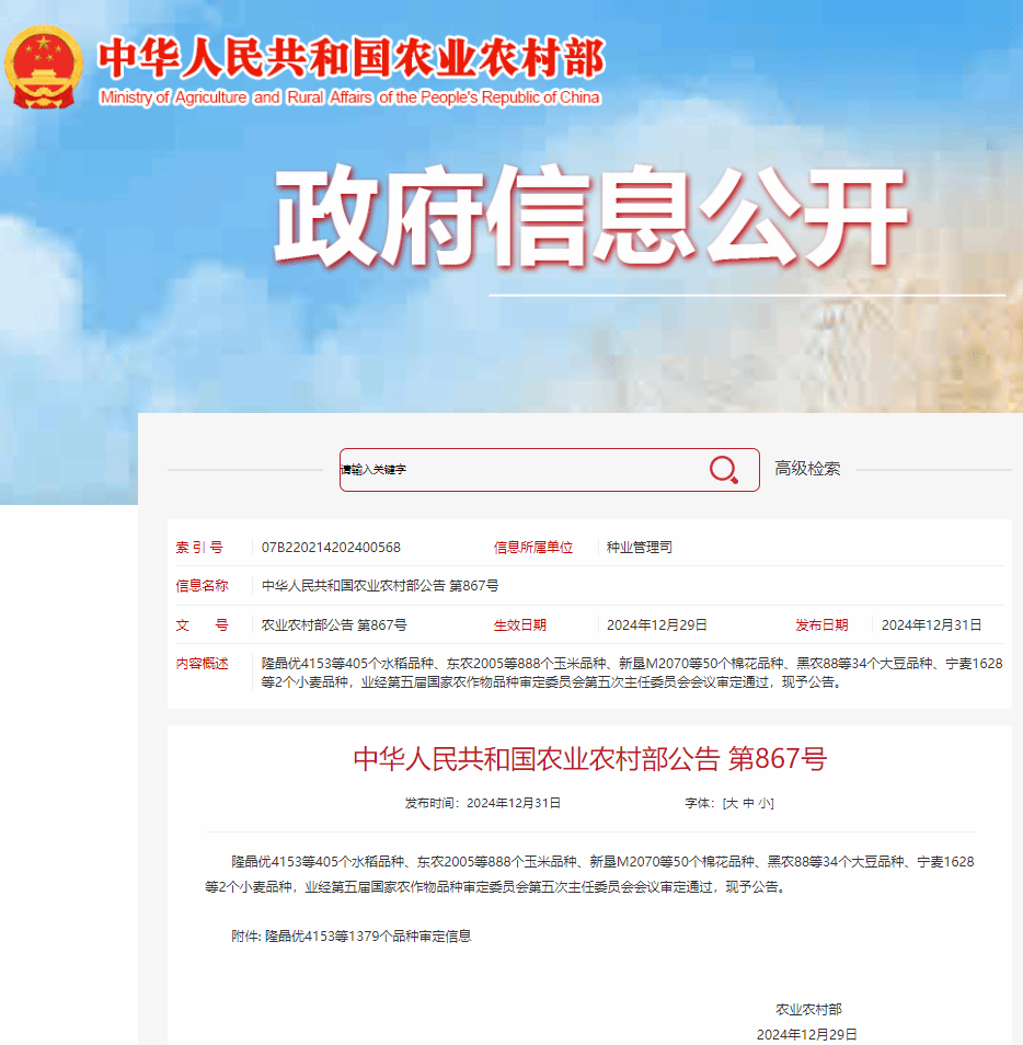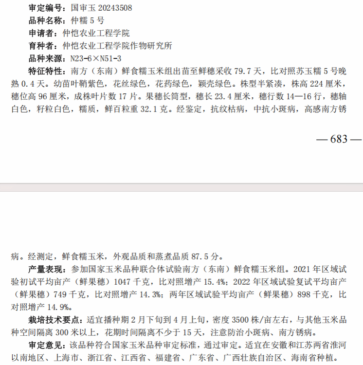 2024年12月29日,中华人民共和国农业农村部发布公告第867号。m88 app自主选育申请的糯玉米“仲糯5号”符合国家玉米品种审定标准,经第五届国家农作物品种审定委员会第 五次主任委员会会议审定通过,经农业农村部公示期满,予以公告。