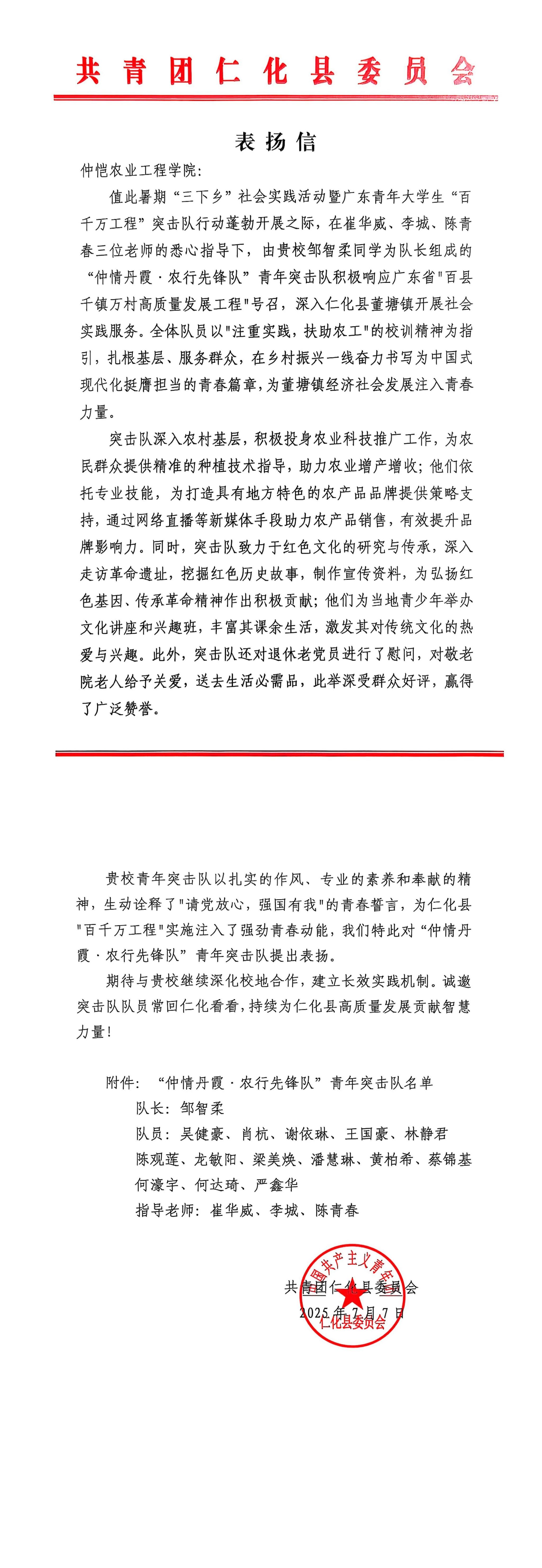 韶关市仁化县团委表扬m88 app三下乡队伍