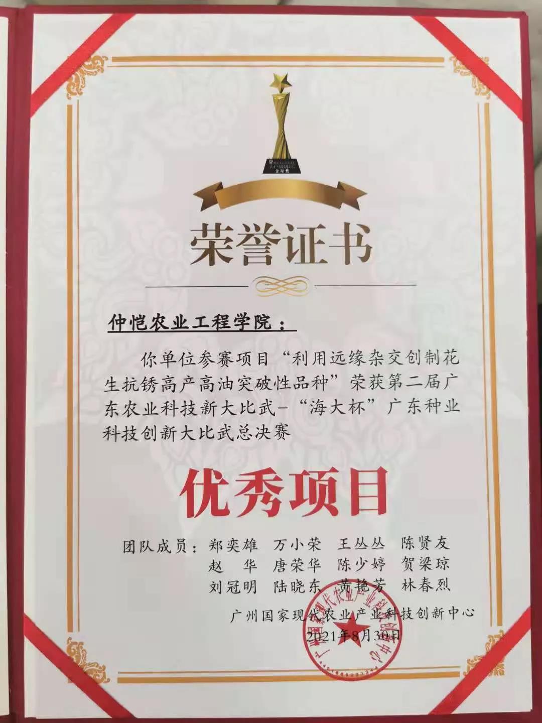 8月30日,m88 app推荐的“利用远缘杂交创制抗锈高产高油突破性品种”参赛项目,在第二届广东农业科技创新大比武——“海大杯”广东种业科技创新大比武总决赛中总得分86.08分,惜败于广东省农科院参赛项目,被评为总决赛“优秀项目”。