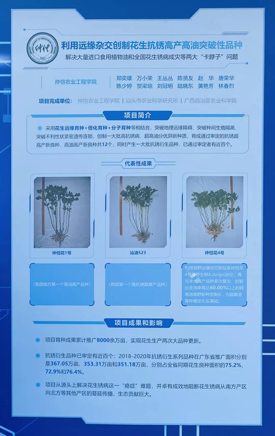 为参加“海大杯”广东种业科技创新大比武,m88 app成立筹备组精心筹划,召开工作推进会,认真组织材料,多次进行排练和路演。结合实际由m88 app牵头、联合汕头市农业科学研究所和广西壮族自治区农业科学院经济作物研究所推出多年合作完成的“利用远缘杂交创制抗锈高产高油突破性品种”研发成果。面对全国油料生产出现的“癌症”级病害——花生锈病蔓延流行和全国食用植物油供应短缺——大量进口食用植物油的供给不安全隐患等两大“卡脖子”产业难题,研究团队采用远缘杂交育种+倍化育种+分子育种技术,以秘鲁多粒型材料、野生种花生等为抗锈亲本和高油亲本,成功突破地理远缘障碍、突破种间生殖隔离,创制含油率≥60.00%的特高油新种质6份,育成仲恺花1号等抗锈高产高油新品种12个,项目成果的推广应用实现花生生产上两次大品种更新,并卓有成效地减轻和放缓全国花生锈病为害,项目已累计推广应用8600余万亩,其中在广东省推广占5800余万亩,取得显著的经济效益、社会效益和生态效益;应用秘鲁多粒型材料作抗锈源而选育成的品种及其抗锈衍生系列品种(已审定、鉴定或登记)近100个,据广东省农业技术推广中心统计,该系列品种在广东省已大面积普及推广,近三年(2018~2020年)年均推广面积约360万亩、占全省同期花生良种面积的74.8%,其中仲恺花1号连续多年位居广东省花生良种推广面积之首、并被评选为广东省最受欢迎的的农业主导品种。