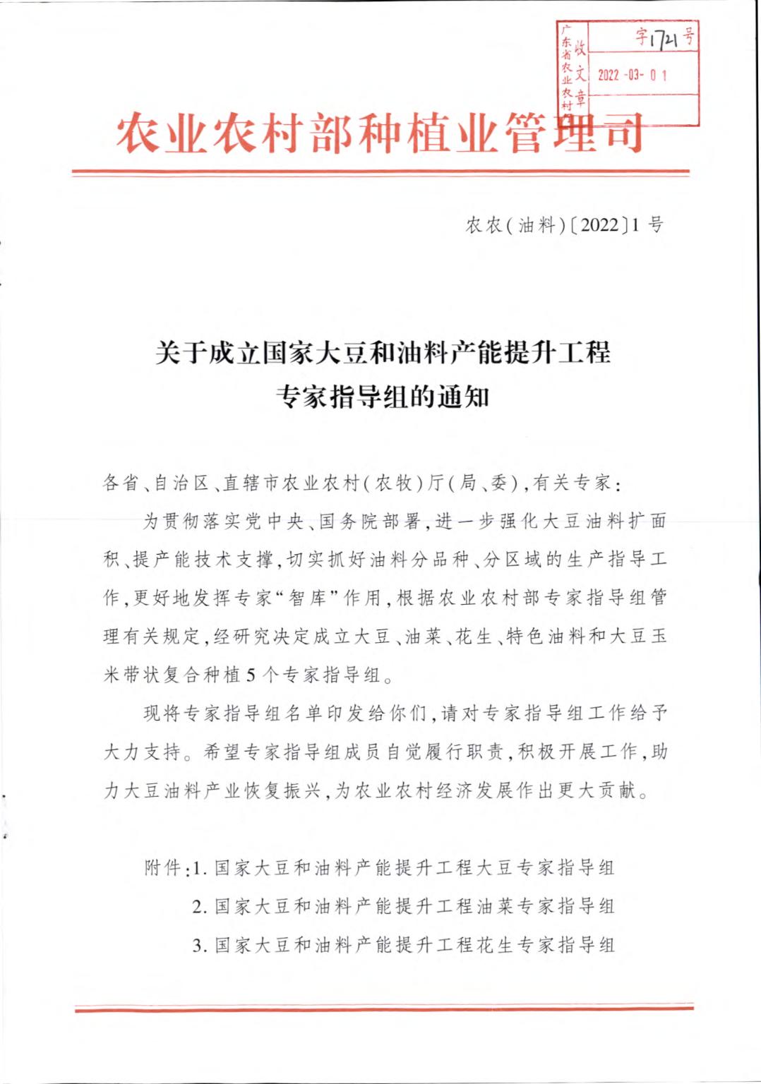 近日,从农业农村部发布的“关于成立国家大豆和油料产能提升工程专家指导组的通知”文件中获悉,m88 app院长、广东省现代农业产业技术体系花生大豆首席专家郑奕雄教授入选国家大豆和油料产能提升工程花生专家指导组成员,m88 app当选为国家大豆和油料产能提升工程专家指导组成员单位。