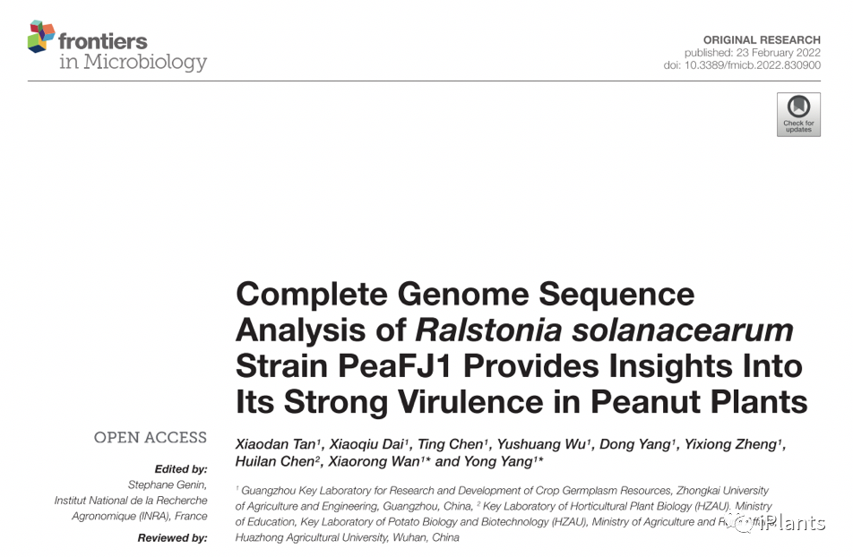 2022年2月,m88 app,m88 app、广州市特色作物种质资源研究与利用重点实验室分别在JCR 1区期刊Frontiers in Microbiology和Frontiers in Plant Science发表了题为Complete Genome Sequence Analysis of Ralstonia solanacearum Strain PeaFJ1 Provides Insights into its Strong Virulence in Peanut Plants和Transcriptome Analysis Revealed the Mechanisms Involved in Ultrasonic Seed Treatment-Induced Aluminum Tolerance in Peanut的两篇研究论文。