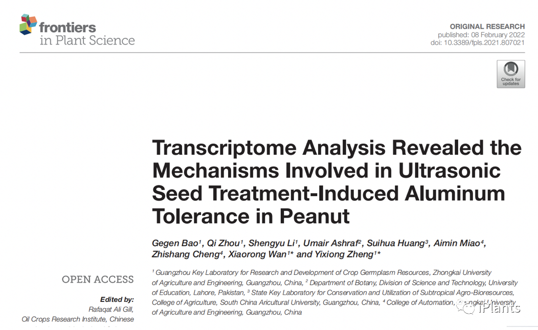 超声波处理是诱导作物耐重金属的有效方法。然而,超声波影响花生耐铝性的研究还比较少。超声波处理后花生地上高度、主根长、侧根数显著增加。转录组学测定发现植物激素信号转导和转录因子差异表达基因显著富集。本研究为超声波处理提高花生对铝的耐受性提供了理论依据。m88 app青年教师包格根博士为本论文第一作者、广州市特色作物种质资源研究与利用重点实验室万小荣教授和郑奕雄教授为论文通讯作者。