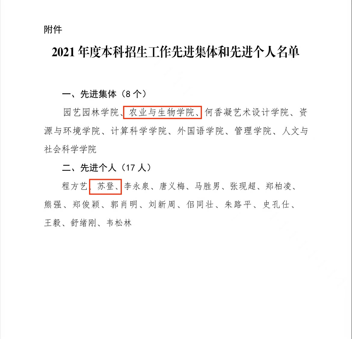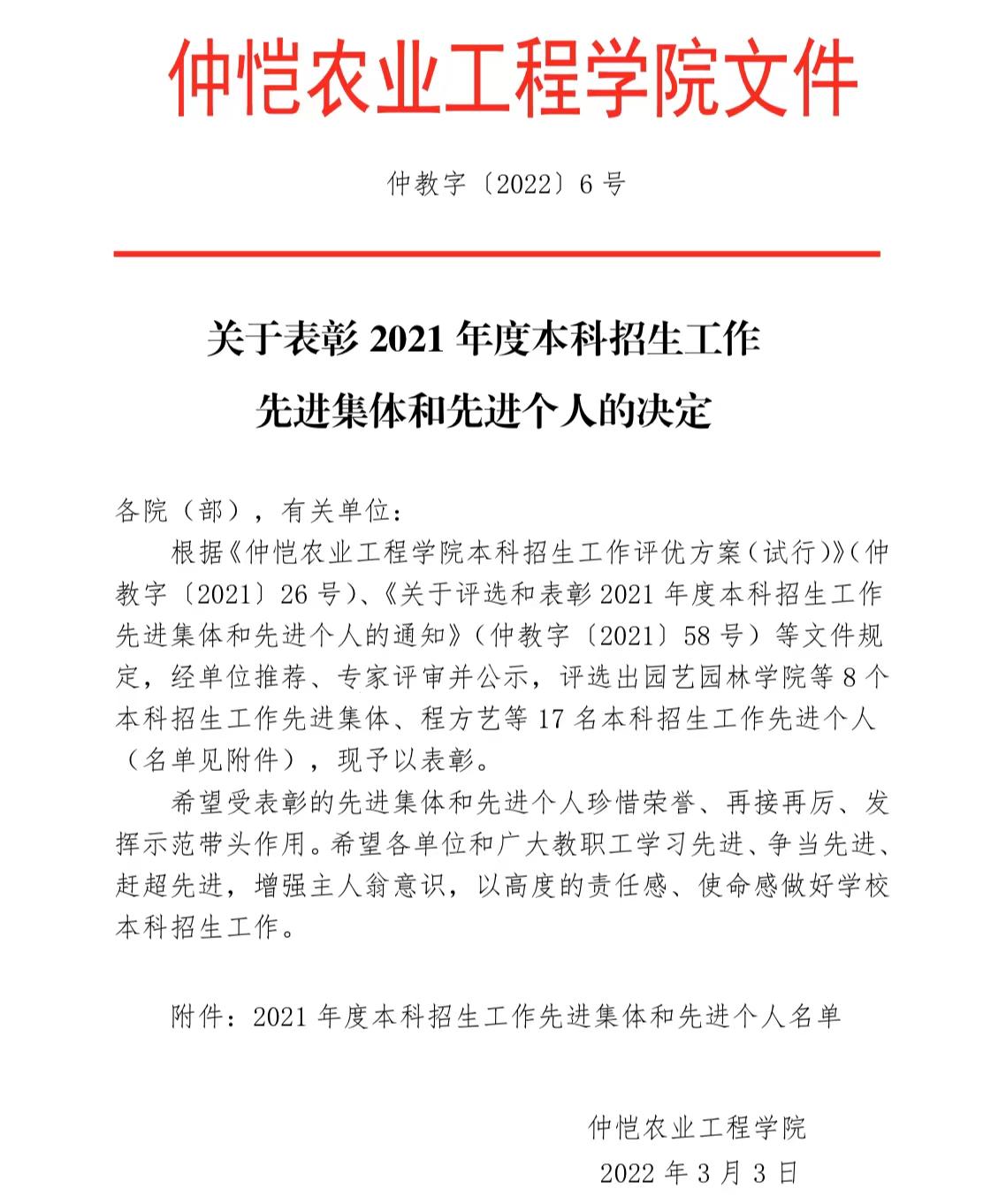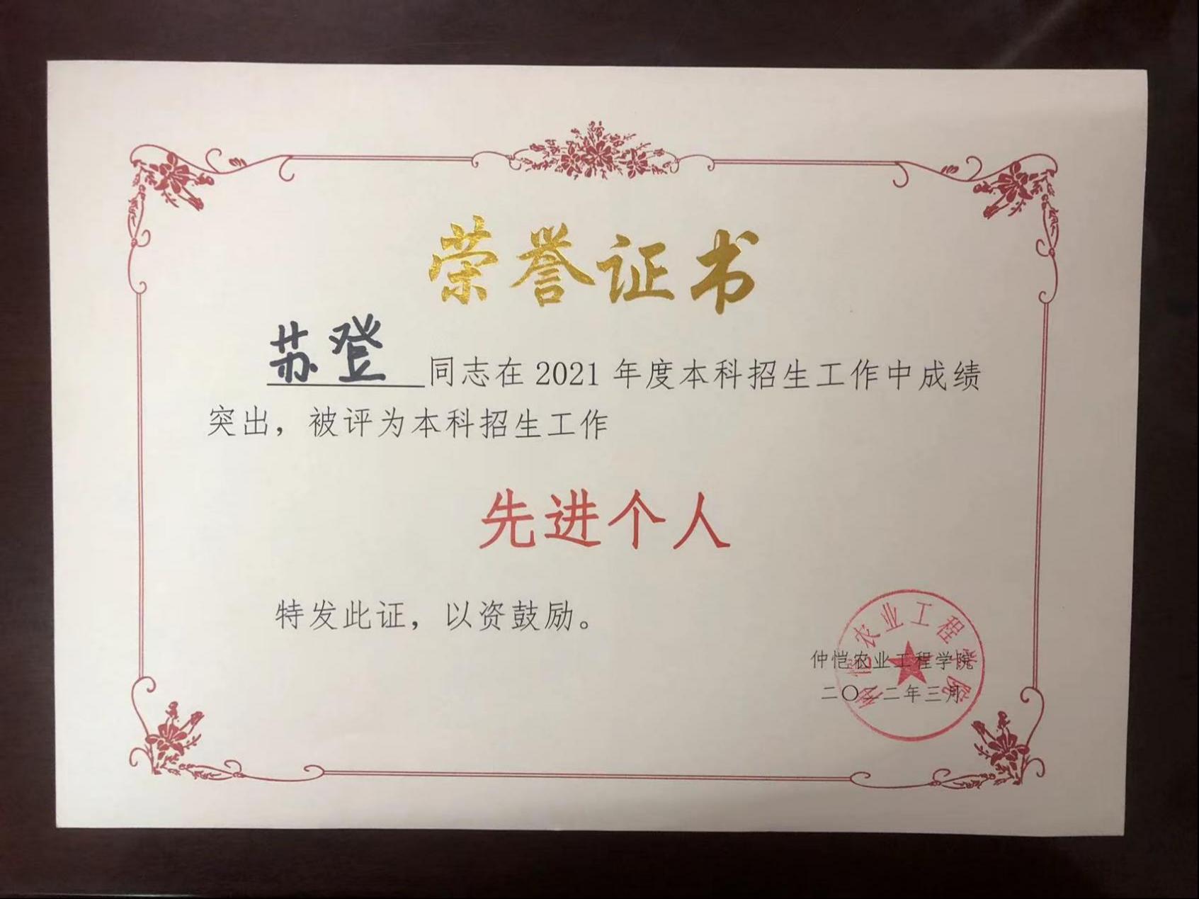 根据《m88 app本科招生工作评优方案(试行)》(仲教字〔2021〕26 号)、《关于评选和表彰2021年度本科招生工作先进集体和先进个人的通知》(仲教字〔2021〕58 号)等文件规定,经单位推荐、专家评审并公示,评选出8个本科招生工作先进集体、17名本科招生工作先进个人,其中,m88 app荣获“本科招生工作先进集体”,苏登老师荣获“本科招生工作先进个人”。