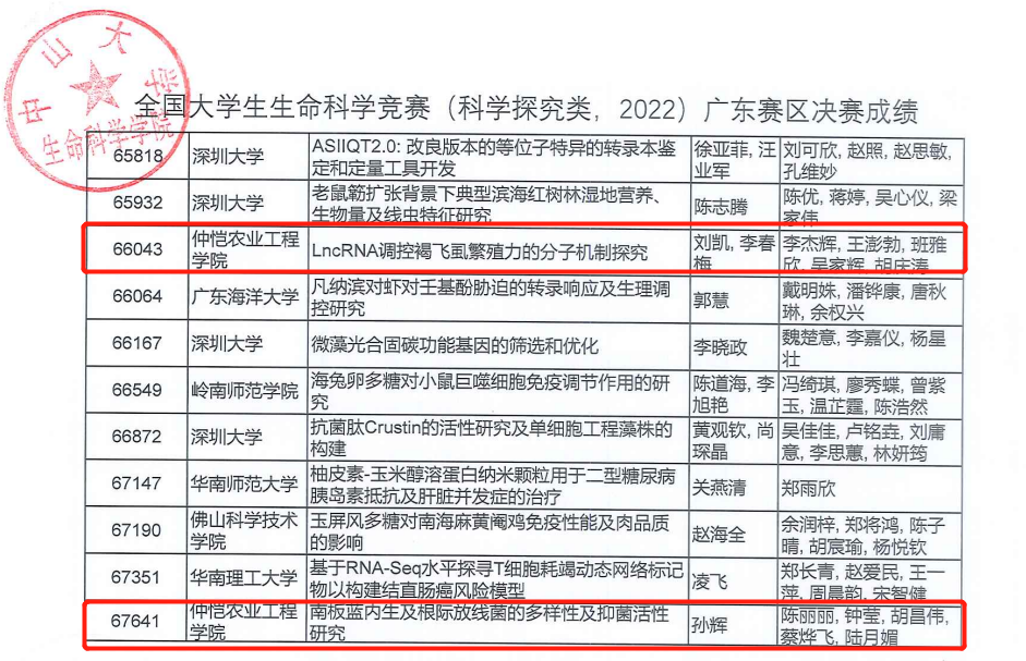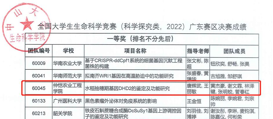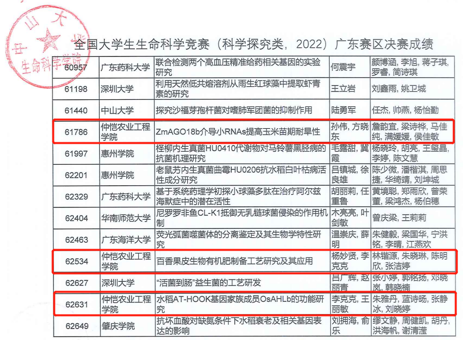 其中,由黄杰豪等主持的《水稻抽穗期基因DHD2的鉴定及功能研究》(指导老师:唐辉武、王丽敏)获得全国大学生生命科学竞赛广东赛区一等奖,并入围全国决赛;由詹韵宜等主持的《ZmAGO18b介导小RNAs提高玉米苗期耐旱性》(指导老师:孙伟、方晓东)、林锴源等主持的《百香果皮生物有机肥制备工艺研究及其应用》(指导老师:杨妙贤、李克克)、朱雅丹等主持的《水稻AT-HOOK基因家族成员OsAHLb的功能研究》(指导老师:李克克、王丽敏)、李杰辉等主持的《LncRNA调控褐飞虱繁殖力的分子机制探究》(指导老师:刘凯、李春梅)、陈丽丽等主持的《南板蓝内生及根际放线菌的多样性及抑菌活性研究》(指导老师:孙辉)分别获全国大学生生命科学竞赛广东赛区三等奖。