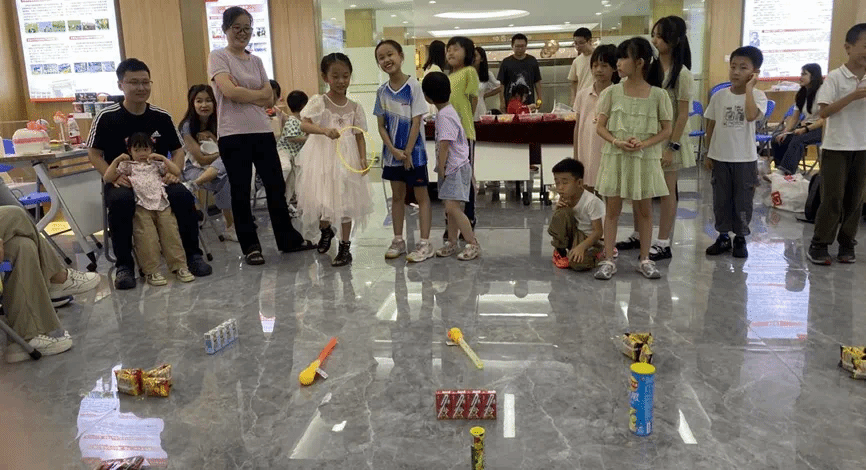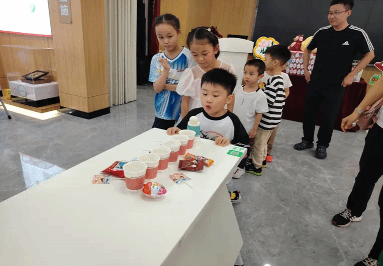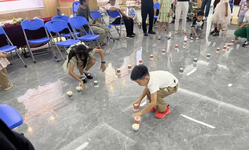 第二个是纸杯游戏,每位小朋友需要将一排纸杯全部翻倒,快者可得到奖品,这锻炼了孩子们的手眼协调能力。