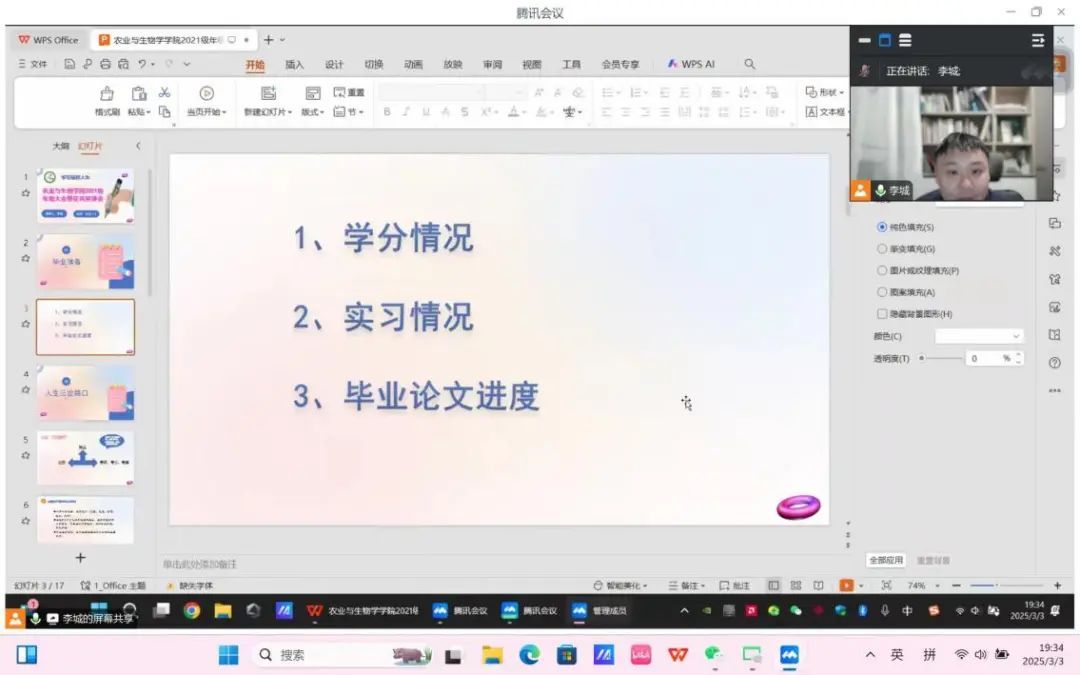 新学期展现新作为,毕业季圆梦绘新图。为鼓励毕业生们勇敢面对未知与挑战,积极地克服在毕业论文、考研、求职过程中的各类困难,预防求职就业诈骗,鼓励学生参军入伍,提前谋划,为顺利毕业做好准备。3月3日晚,m88 app通过线上会议举行了2021级年级大会。辅导员李城以及2021级农学、植保、种科、中草药等4个专业的全体学生参与本次会议。会议由李城主持。