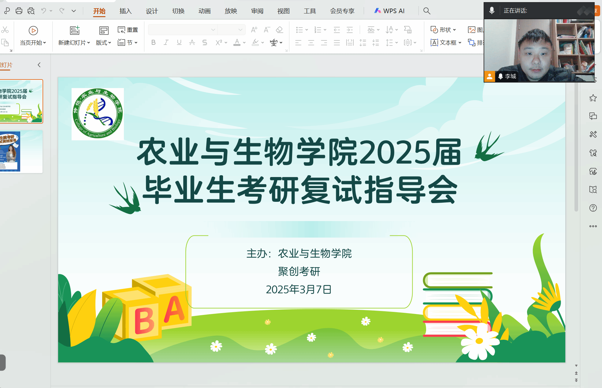 李城随后就考研复试提出了三点建议:首先,应保持自信与从容,以泰然自若的姿态应对挑战。其次,需做好充分准备,丰富自身的学科理论知识及英语技能,力求全面展示个人的综合素养和科研潜力;再次,应着眼未来,特别是农业与生物科学领域,将所学知识应用于实践,为国家农业事业的发展贡献力量。最后,他对同学们表达了诚挚的祝福与深切的期望。希望同学们在复试中既能展现严谨求实的科学精神,也能传递心怀家国的人文情怀。学院永远是同学们的后盾,期待大家带着捷报归来,续写属于2025届毕业生的荣光!