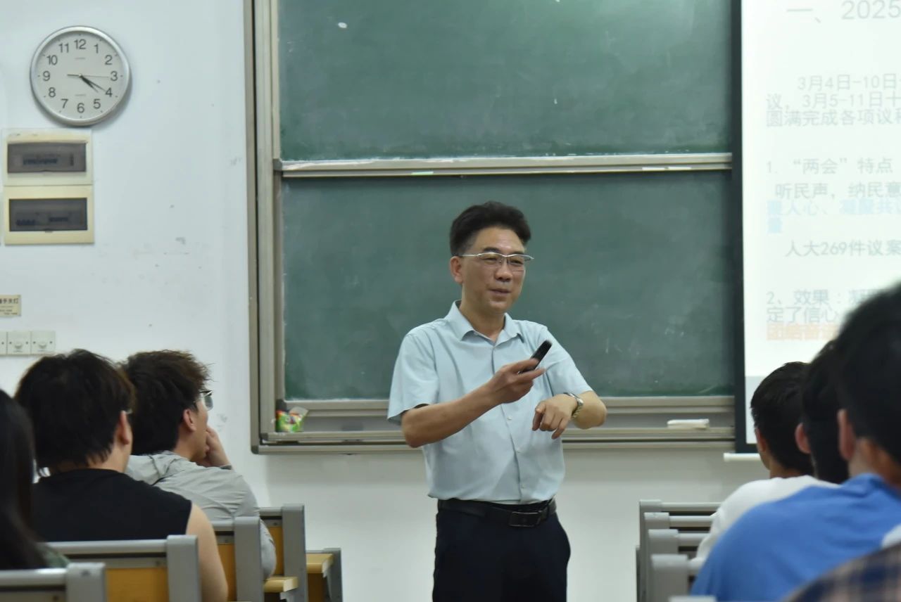 授课过程中,周超雄结合实际案例,深入浅出地介绍了全国“两会”的基本情况和解读了“两会”精神,强调农业现代化的重要性,激励学生们勇于创新,积极投身乡村振兴事业。他指出“青年是国家的未来,应以坚定的信仰和扎实的知识,肩负起时代赋予的重任,将个人理想融入国家发展大局,以实际行动践行‘两会’精神,助力农业现代化进程。”周超雄的话语铿锵有力,掷地有声,深深触动着每一位学子的心弦。课堂上,学生们聚精会神,时而沉思,时而笔记,仿佛在心中种下了理想的种子。