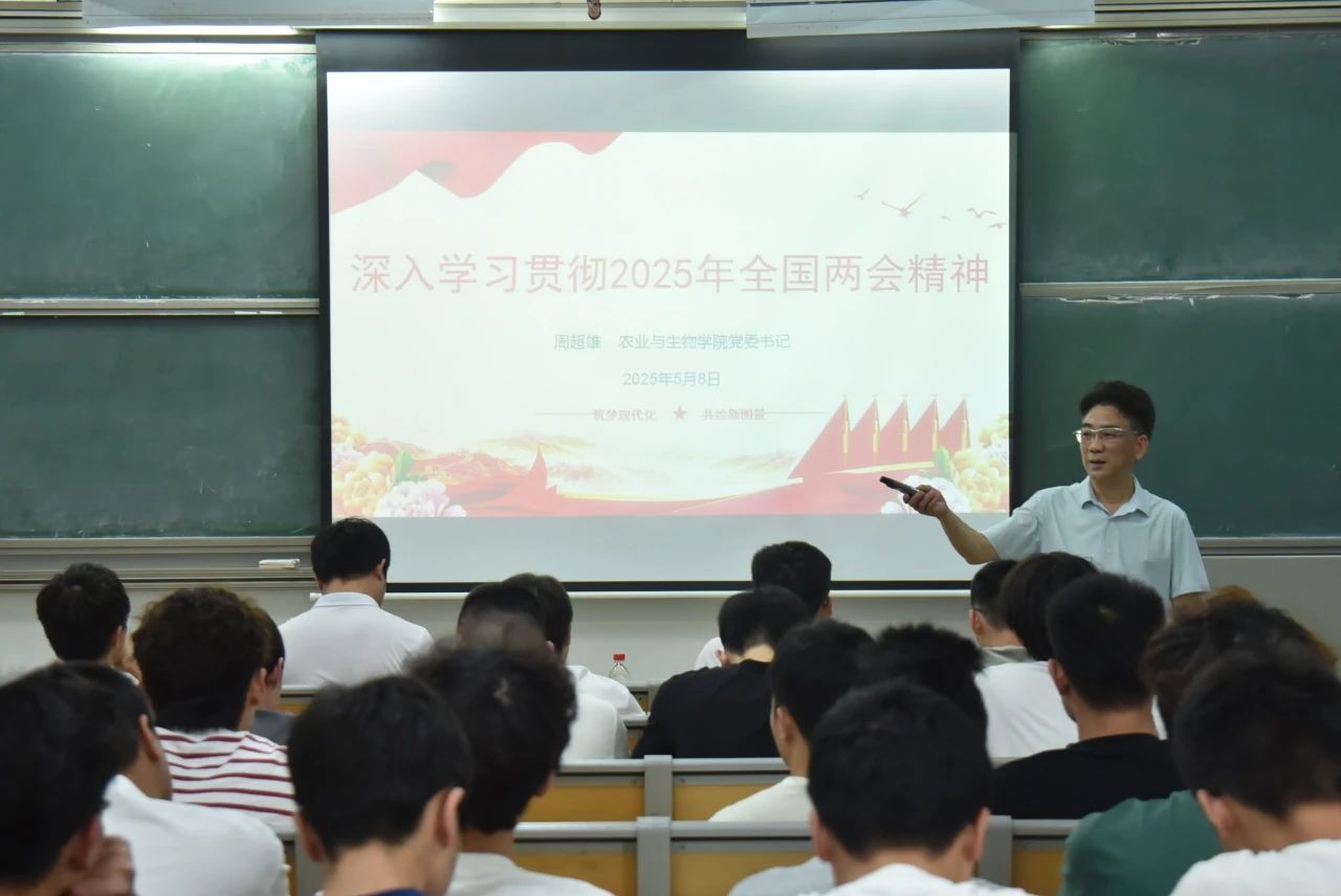 为落实立德树人根本任务,深化青年学生思想政治教育,5月8日下午,m88 app党委书记周超雄在白云校区综合楼402室为24级农学系全体学生讲授了主题为“以高质量发展推进中国式现代化----学习贯彻2025全国‘两会’精神”思政课。学院辅导员梁定超和农学系24级学生共同参与学习。