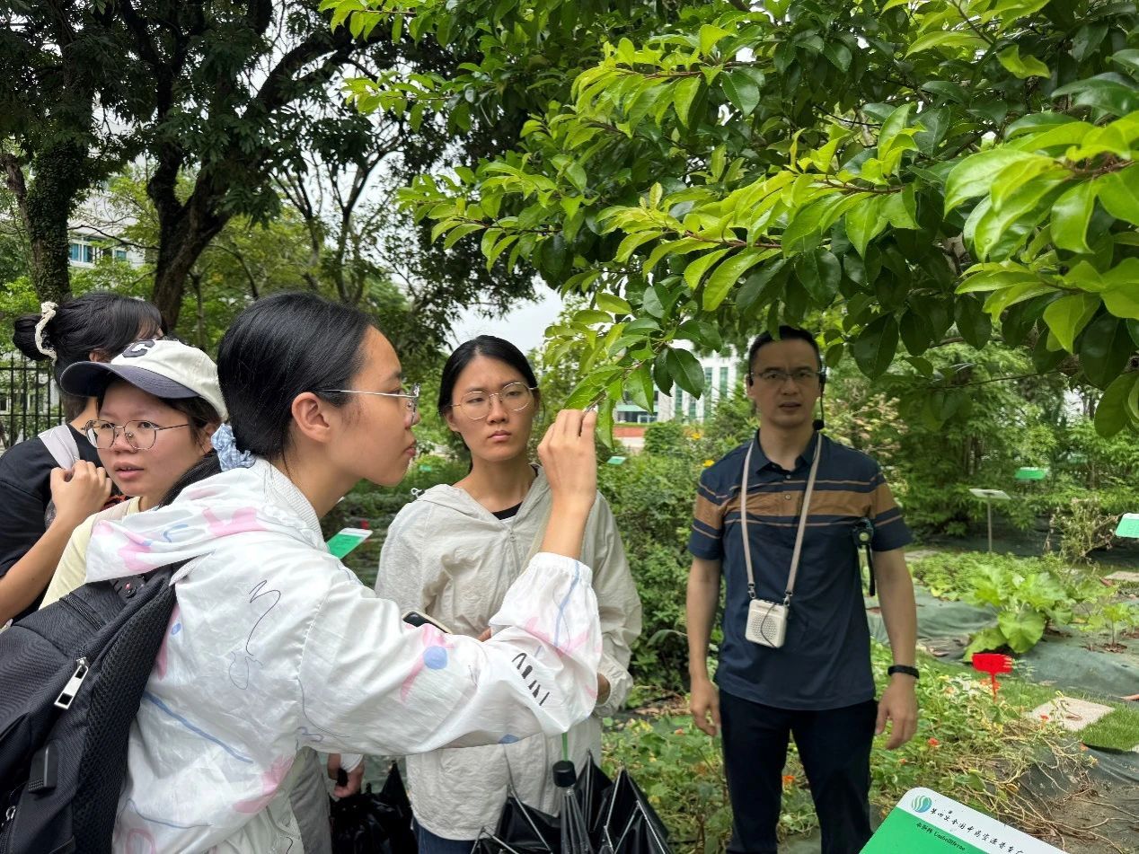 随后,一行人来到药王山。夏日的药王山,草木葱茏,各类药用植物争奇斗艳。广州中医药大学童老师以丰富的专业积累和生动的讲解,为同学们开启了一场药用植物的探秘之旅。在一株株药用植物前,童老师先详细介绍其鉴定特征,从叶片的形状、颜色,到花朵的形态、气味,再到根茎的纹理、质地,进行细致入微的剖析,面对形态相似的植物,童老师耐心教导同学们如何通过细微差别进行准确鉴别;此外,童老师还着重讲解了这些植物的入药部位和独特药效,有的药用植物不同的入药部位会产生完全不同的药效。同学们全神贯注,时而弯腰仔细观察植物的根茎,时而踮脚查看枝叶的生长形态,与童老师热烈互动,在实践中积累药用植物的鉴别经验。