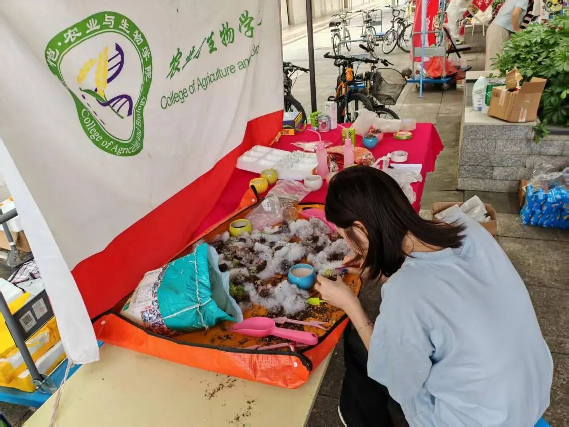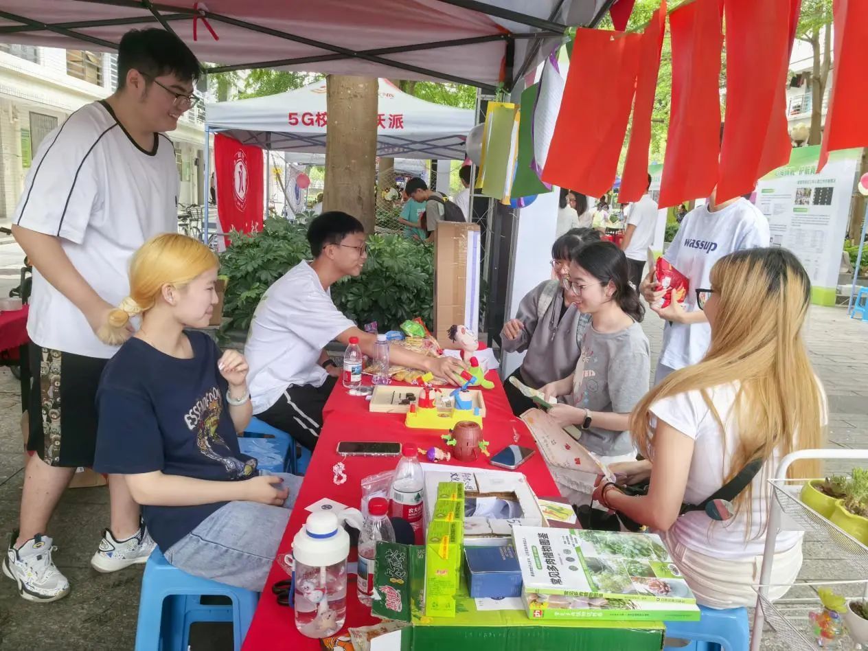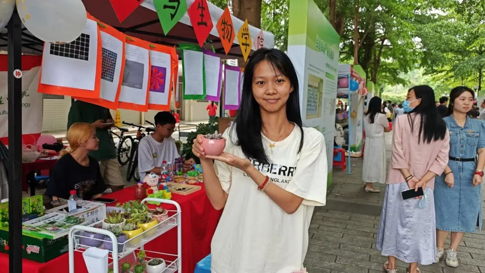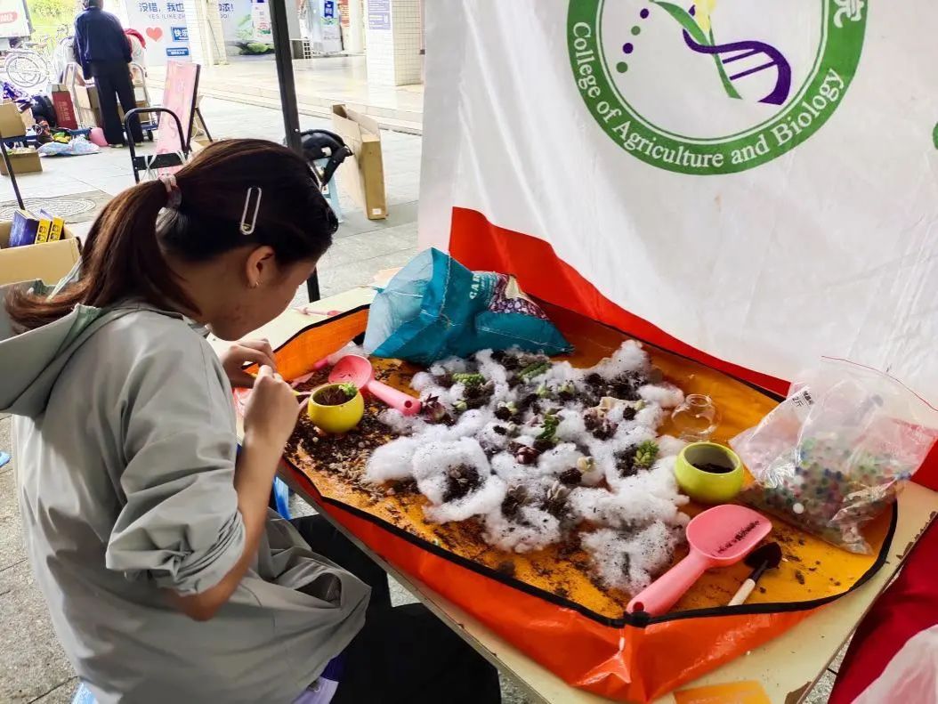 DIY多肉栽种体验区流淌着宁静与创意的气息。工作人员早早备好了形态各异的多肉植株、精致花盆与栽种工具,同学们围坐在一起,小心翼翼地将多肉植入土壤,搭配上小石子等装饰物,打造独一无二的绿植景观。一位女生专注地用镊子调整叶片角度,笑言:“看着多肉一点点成型,感觉内心也被治愈了。”现场不时有同学互相交流栽种技巧,或是举起成品拍照分享,指尖的绿意与脸上的笑容相映成趣。
