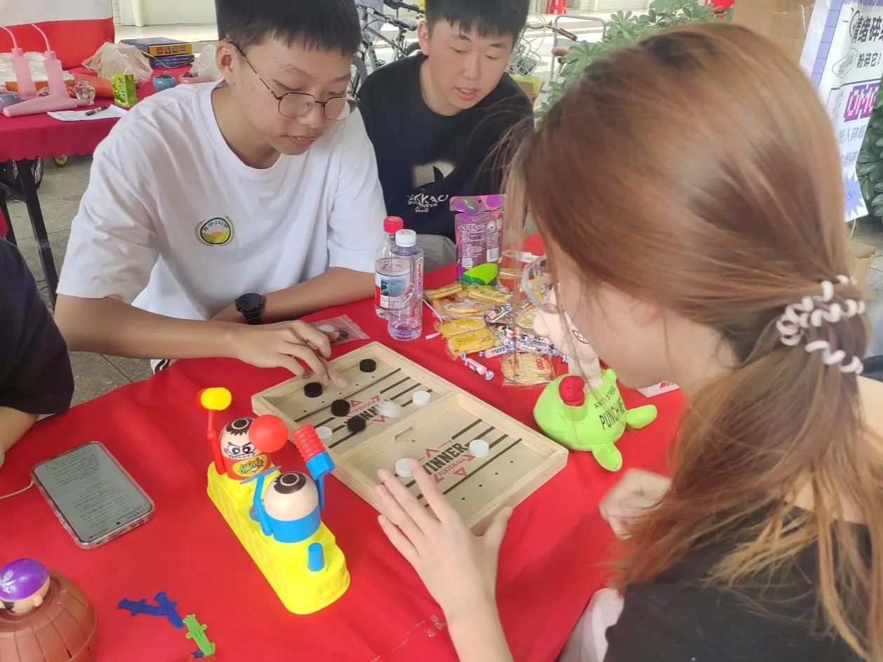 在游戏互动区,不时传来阵阵欢声笑语。在“心理知识问答”摊位前,同学们排队抽取题目,有的蹙眉思考“什么是巴纳姆效应”,有的因答对题目露出欣喜笑容,根据答对题数兑换果冻、奶糖等零食奖品,现场洋溢着成就感与欢乐氛围;“小人对打攻守战”与“双人弹射棋”摊位前,两位同学正全神贯注地操控按钮与弹射器,围观者加油助威声此起彼伏,率先击飞对手小人或完成棋子布局的获胜者引来掌声一片;“情绪粉碎机”摊位则成为心灵的“秘密基地”,不少同学在情绪回收卡上写下“考试压力大”“迷茫焦虑”等心事,投入粉碎机后换取一张印着暖心话语的心理彩虹卡片,愁容随纸片一同" 粉碎 ",笑容重新洋溢在脸上。