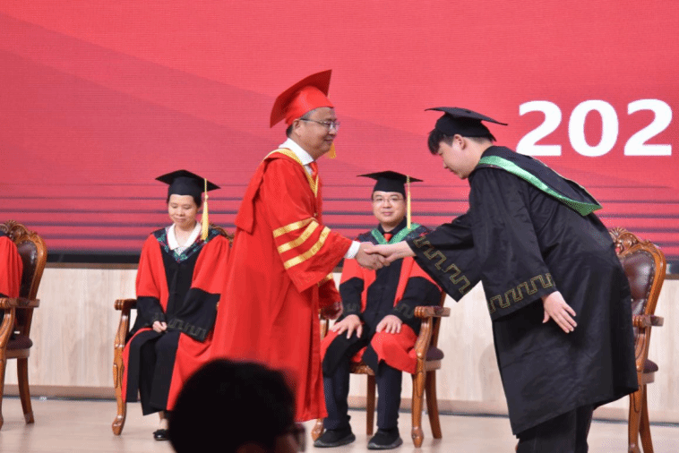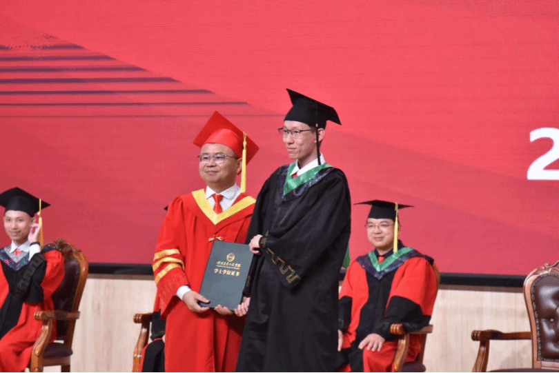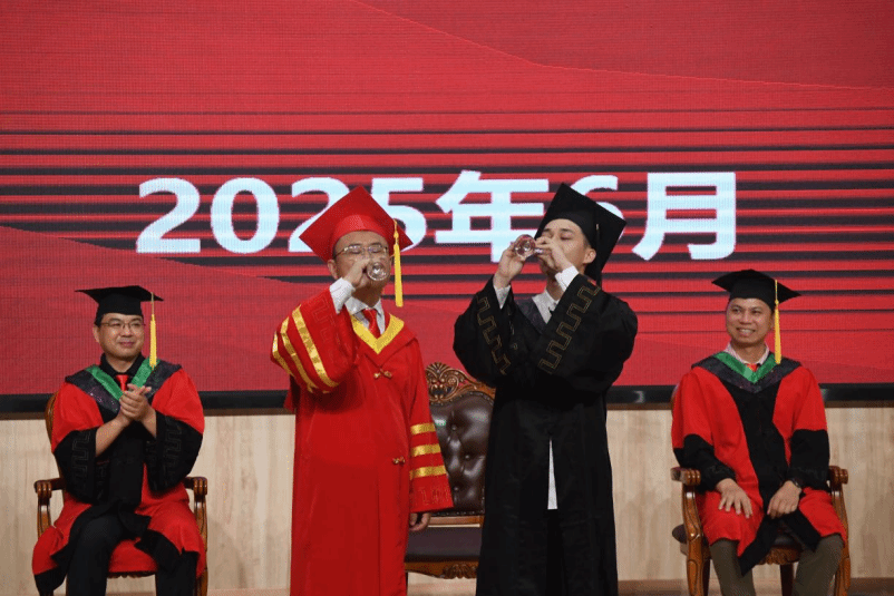 致辞完毕,喻国辉院长为每一位同学拨穗正冠。当流苏从右至左轻拂,是知识沉淀的见证,更是责任与使命的交接。导师们与毕业生握手、合影,目光里满是欣慰与祝福,这一个个瞬间,定格成青春最珍贵的剪影。