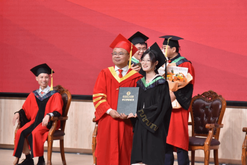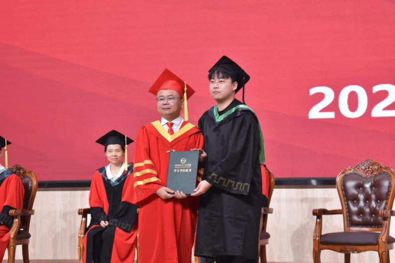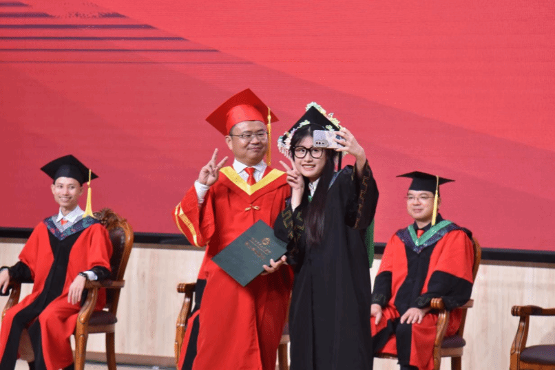 毕业生们身着学士服,带着期许与忐忑,依次踏上授位台。现场满是温馨与感动,有的同学与师长拥抱,将校园情谊化为有力的温度;有的带着创意道具拍照,把青春的活泼与不舍融入画面。这一场仪式,不只是学位的授予,更是学院对学子们“始于初心,成于坚守”的肯定,是“今朝暂别,来日方长”的期许。