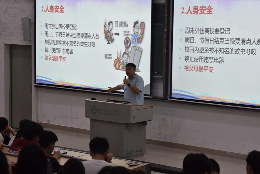 会议中,李城还向新生介绍了《新生手册》,希望大家认真阅读,熟悉学校规章制度、奖助政策及教学安排,它将成为大家适应大学生活的重要指南。在宿舍生活与日常规矩上,他指出需保持宿舍整洁、按时作息以不影响他人,同时要合理用电、禁止使用违规电器,并提醒大家尊重室友,遇矛盾及时沟通。关于上课与考试纪律,他强调要按时上课,杜绝迟到、早退、旷课,严格遵守课堂纪律、认真听讲;考试严禁作弊,一经发现将按校规严肃处理。