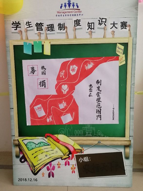 复赛阶段,选手需要制作“学生管理制度”主题的手绘作品。在学生事务管理服务中心提供的比赛主题中,m88 app抽取的主题是“校园募捐”。四名同学围绕这一主题开始了创作。经过缜密的构思与耐心的绘画,名为《秩序下的爱心》的手绘作品终于完成。以温暖的橙红色捐款剪影作为主背景,与校园募捐主题相呼应,八个小图标涵盖了学生制度管理里校园募捐管理方法的要点。弯曲如波浪的线条将八个图标有序分隔开,寓意校园募捐要在规则制度里进行才能有条不紊地开展。整幅作品简介明了,主题突出。