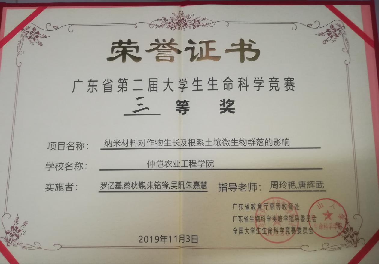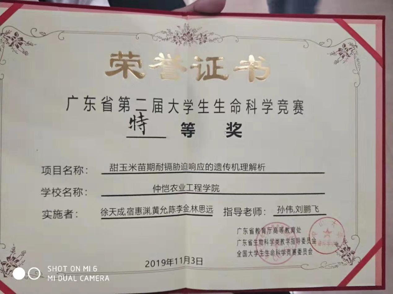 11月3日,第二届广东省大学生生命科学竞赛(第三届全国大学生生命科学竞赛广东省赛区复赛)在中山大学圆满落幕。在本次省赛中,m88 app有两支队伍脱颖而出。其中,由徐天成、陈李金、宿惠渊、黄允、林思远、高紫微组成的团队,在孙伟副教授和刘鹏飞副教授的悉心指导下,以研究项目《甜玉米苗期耐镉胁迫响应的遗传机理解析》荣获特等奖,该队伍将进入国赛,竞争国家一二等奖。除此之外,m88 app另一支由罗亿基、蔡秋蝶、朱嘉慧、朱铭锋、吴阳等5位同学组成的队伍,在周玲艳教授和唐辉武副教授的悉心指导下,以研究项目《纳米材料对作物生长及根系土壤微生物群落的影响》荣获本次竞赛三等奖。
