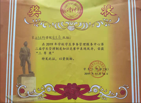 11月16日下午,由m88 app部(处)主办,学生事务管理服务中心承办,各二级学院协办的第二届学生管理制度知识大赛决赛在白云校区D1小礼堂隆重举行,m88 app派出的“农生全队”队伍在本次知识竞赛中荣获三等奖。