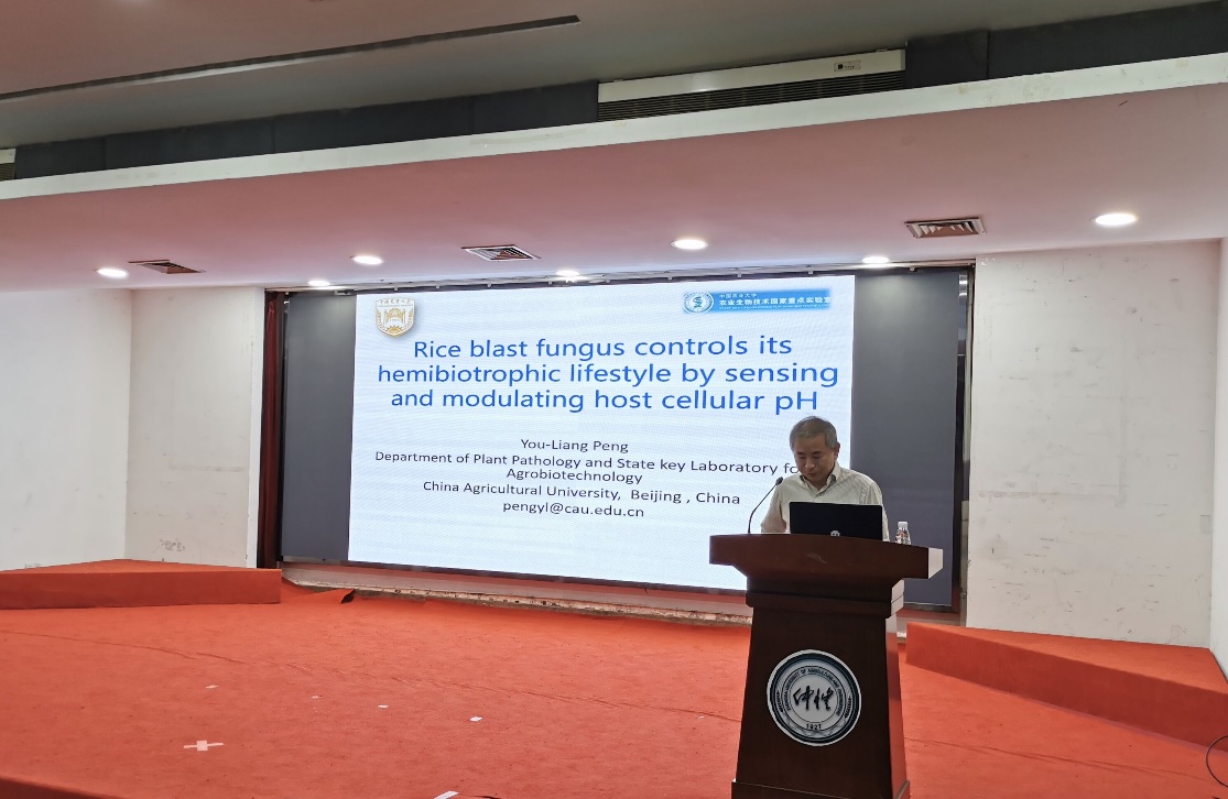 彭友良教授以《稻瘟菌控制半活体营养的机理》为题,报告由浅入深,从绿色农药设计所需候选靶标的筛选标准、稻瘟菌半活体营养机理和PacC途径参与稻瘟菌半活体营养的分子机制等方面分享了自己的科研经历和近期科研成果。