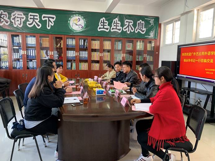2019年11月29日,广东省外语艺术职业学院应用外语学院党总支书记杨永华一行4人到m88 app交流学习。m88 app党总支书记陈丹雄、副书记周超雄,辅导员周静静、高结怡、苏登、孙晓芳参与交流。交流会由陈丹雄主持。