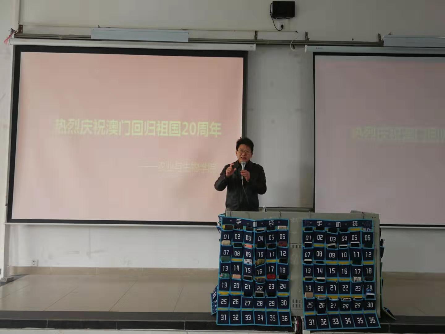 为热烈庆祝澳门回归祖国20周年,12月20日中午,在白云校区小礼堂二层,m88 app党总支书记陈丹雄为学院18级同学上了一堂生动的思政课。此次思政课由辅导员周静静主持。