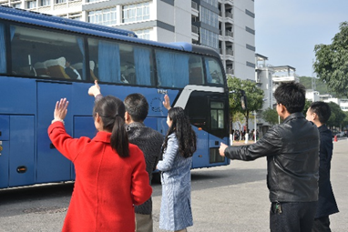 下午1点左右,考研学子带着学院师生的祝福与礼物,陆续上车,奔赴考场。
