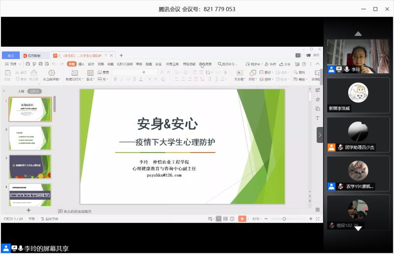 最后,李玲老师给同学们提供了疫情期间更好地处理交际关系的方法,她鼓励同学们大胆主动地与同学、朋友们进行线上沟通,抓住每一次沟通交流的机会来锻炼自己的交际能力,这才能在疫情期间更好地与他人沟通,更好地调整自我。